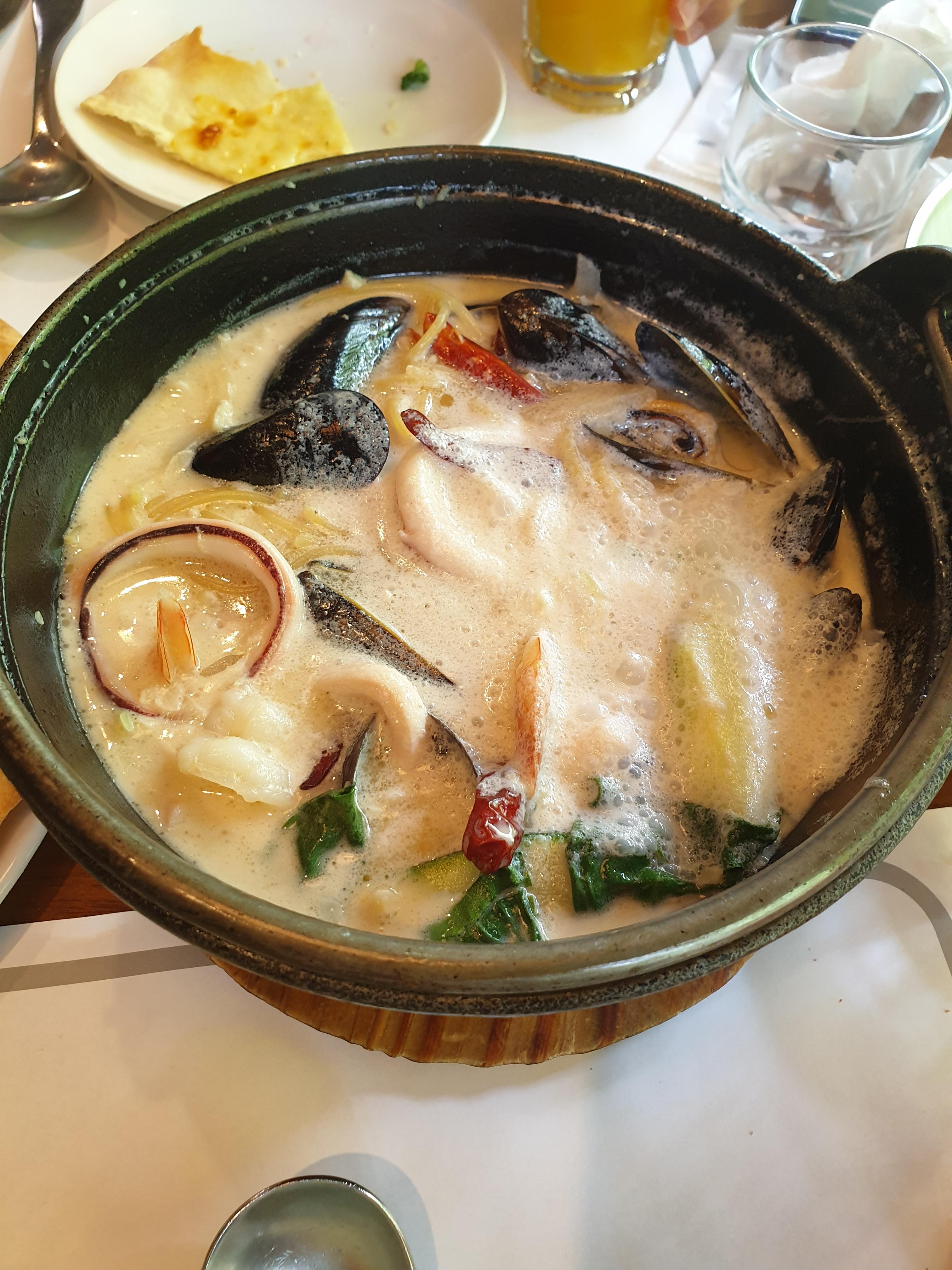크림빠쉐는 사실 꾸덕한 크림스파게티를 예상하고 시킨 메뉴였는데 국물이 보글보글 끓여진 국물파스타였어요. 홍합,새우, 오징어 등 해물이 푸짐해서 나가사키 짬뽕이 연상되는 비주얼입니다. 뚝배기에 담겨 다 먹을 때까지 따뜻하게 먹을 수 있었어요.