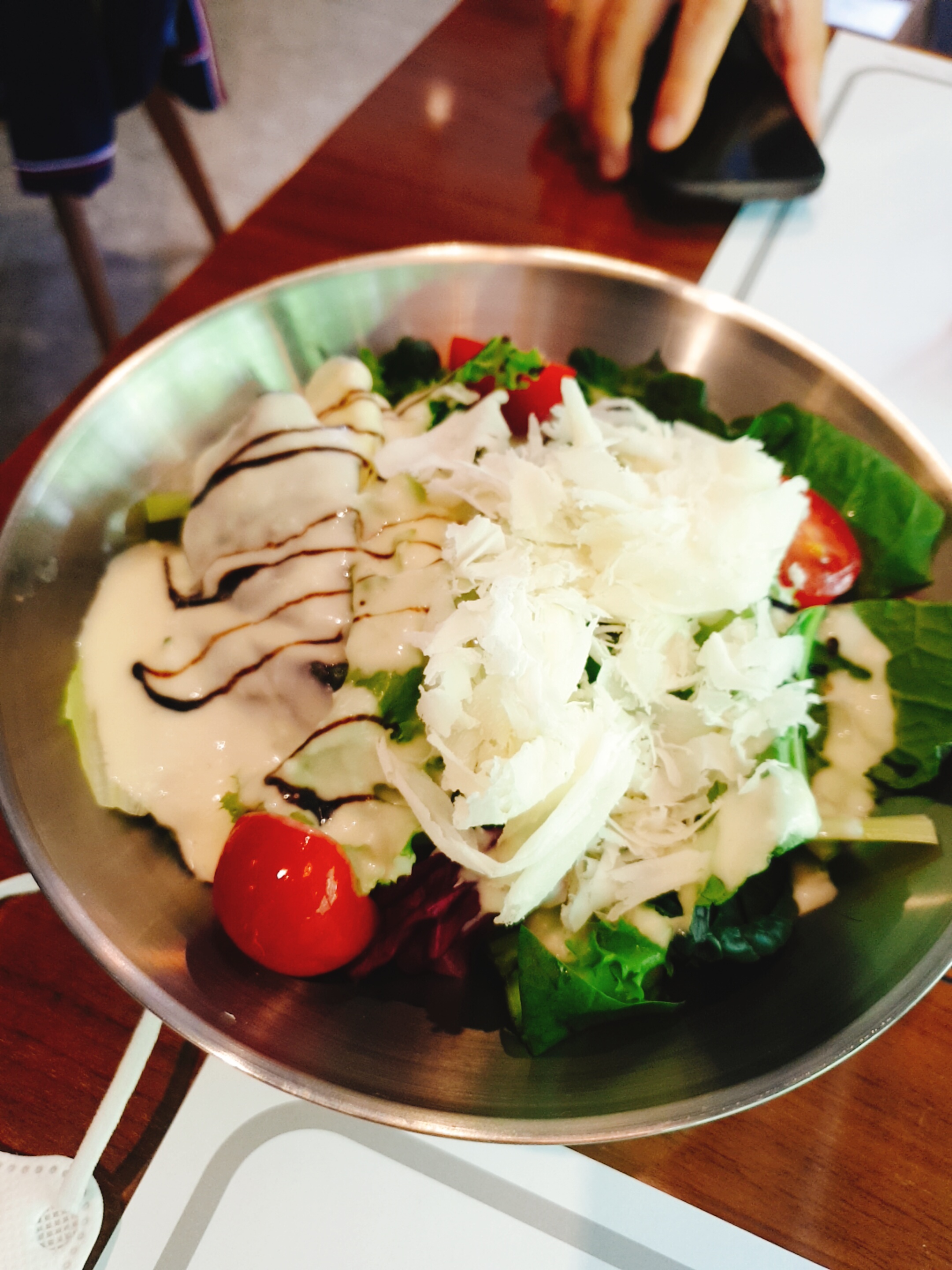 세트에 나온 샐러드입니다. 샐러드의 야채가 매우 푸짐하고 소스는 시저샐러드 소스와 비슷했어요. 치즈를 잔뜩 갈아주시는데 풍미가 좋았어요.