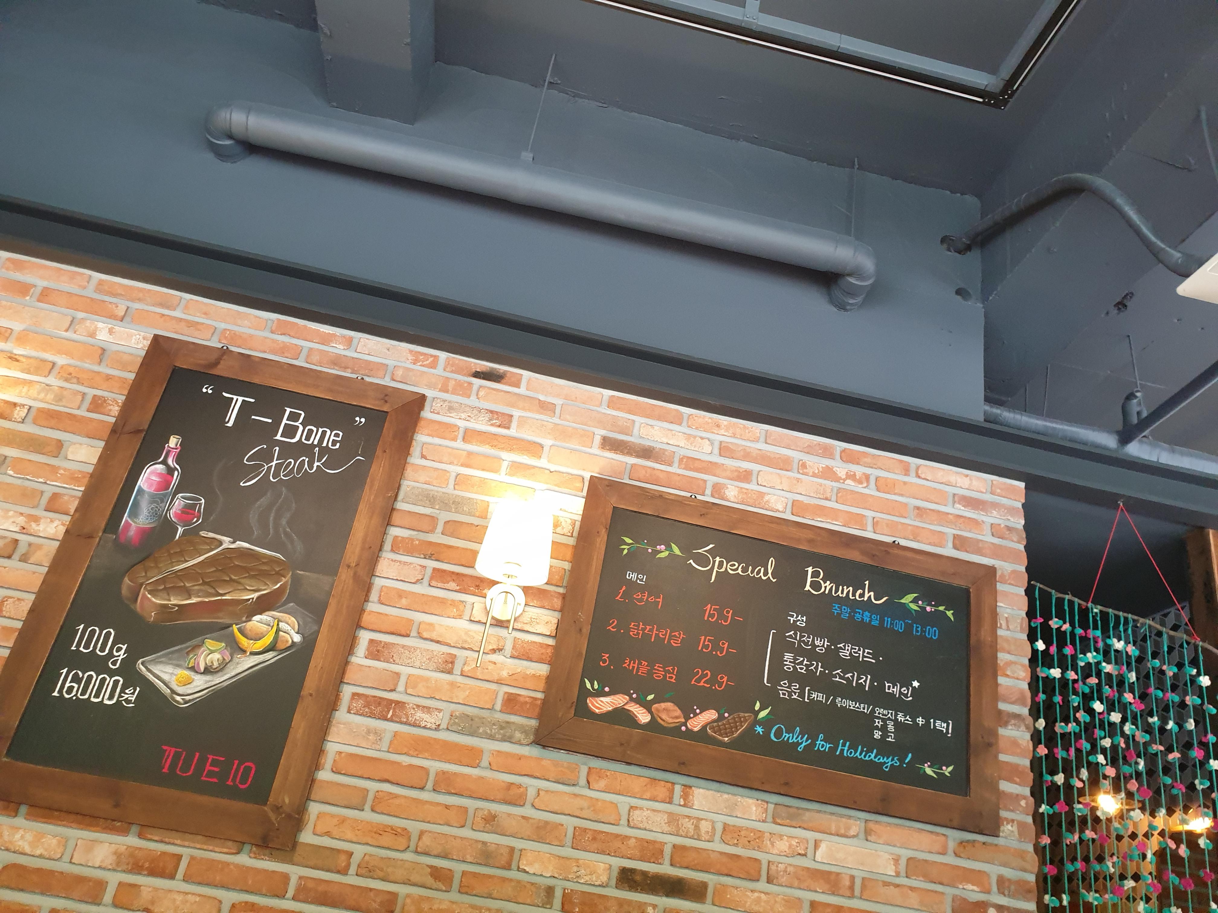 주말에는 스페셜 브런치를 연어, 닭다리살, 채끝등심 중 택일하여 제공하네요. 구성이 매우 알차다고 느꼈어요. 좌측 메뉴판에는 티본스테이크를 소개하는데 저녁에 와서 한번 먹어봐야겠어요.