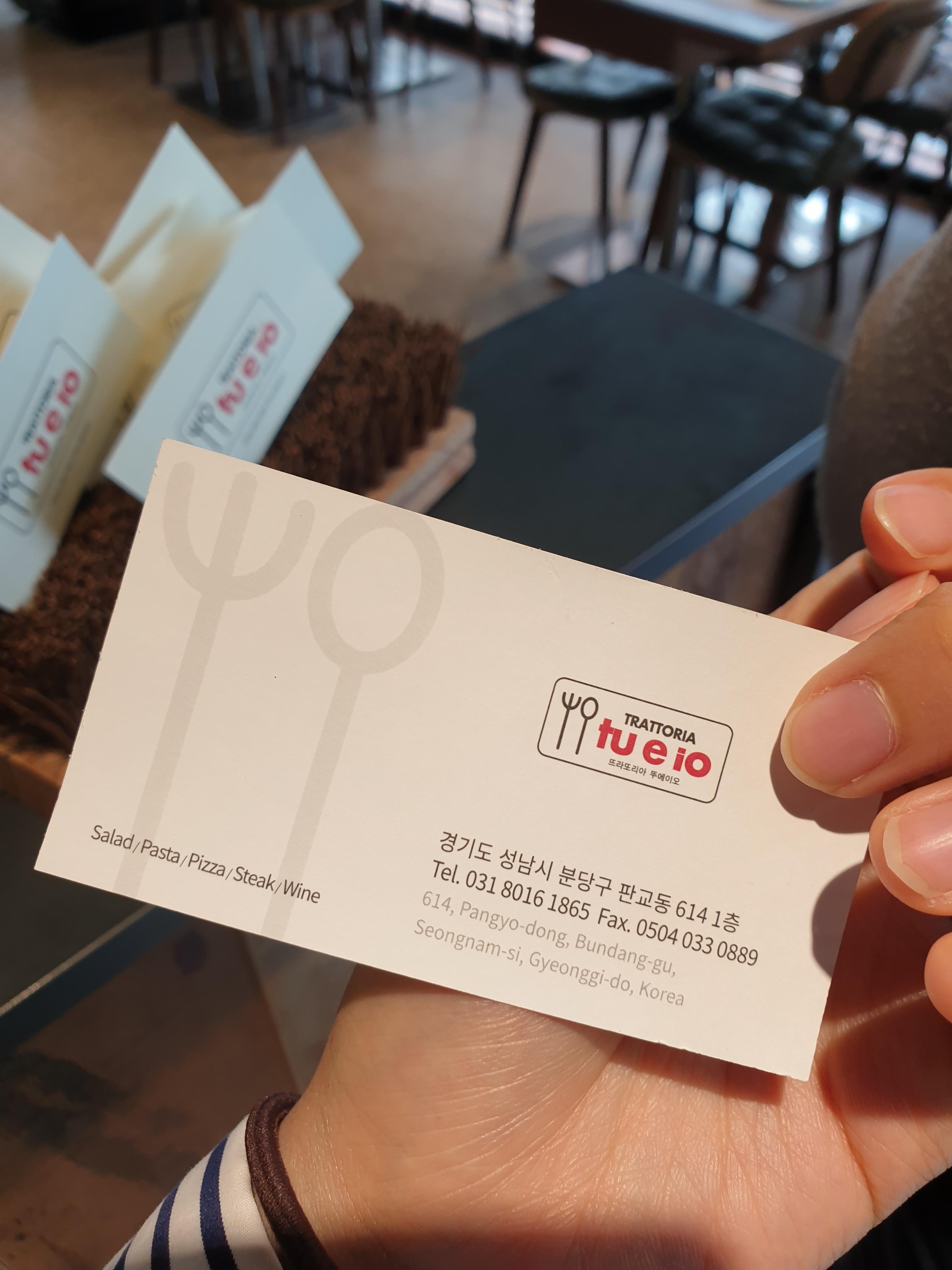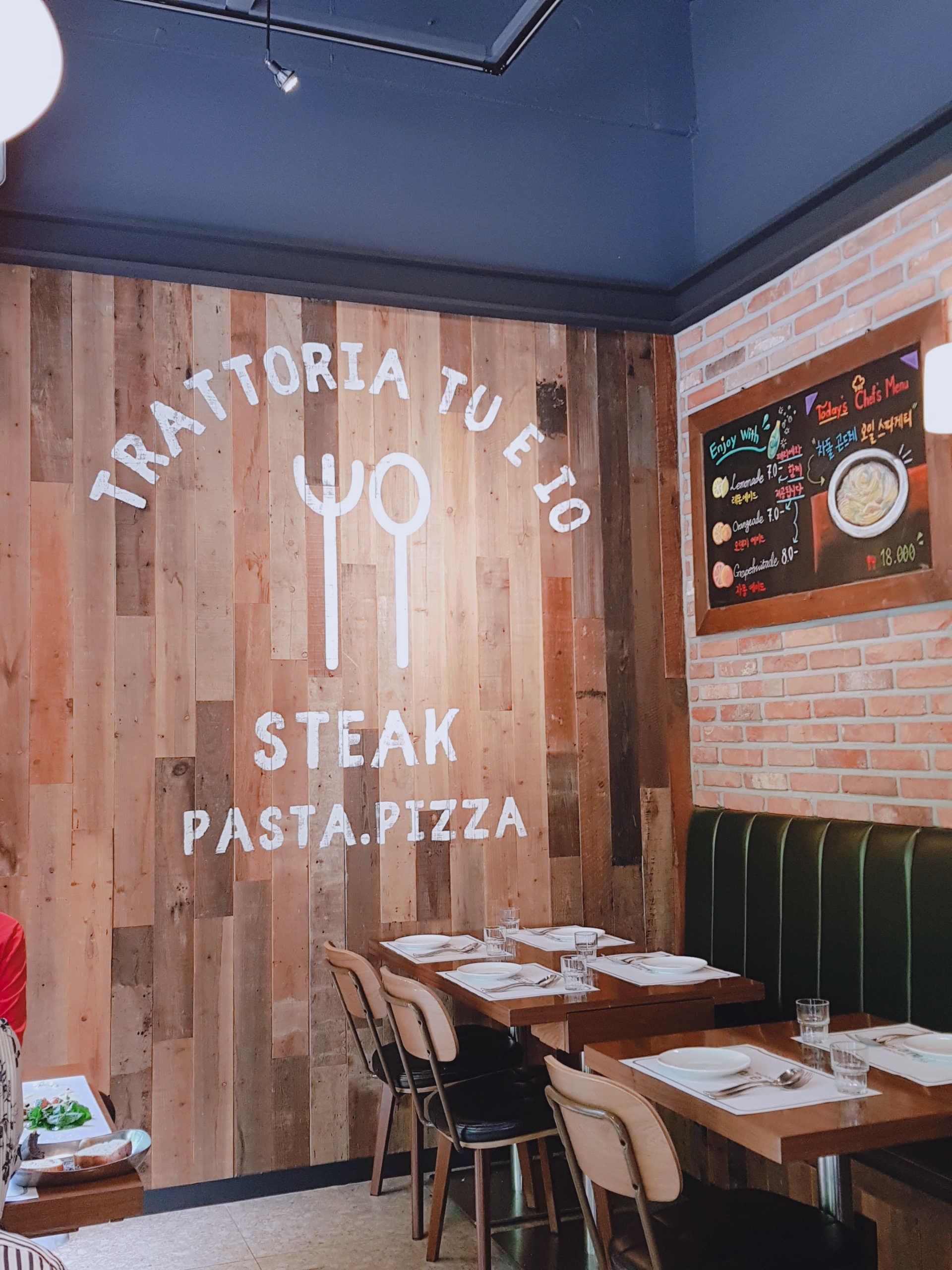 뚜 에이 오(TU E IO)는 이탈리아어로 '너와 나'라는 뜻이라고 합니다! 참고로 트라토리아가 무슨 의미인지도 찾아보았는데 누추한 식당이라는 의미라고 해요~ Ristorante(리스토란테)는 흔히 보는 레스토랑, bistro(비스트로)는 바 형태의 음식점이라고 합니다. 실제로는 레스토랑의 느낌이 물씬 풍겼어요.