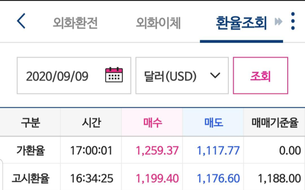 9월 9일자로 환율을 조회해보면 고시환율은 1199.4원 임에도 정확히 5% 더 붙여 1259.37으로 가환율이 현시됩니다.