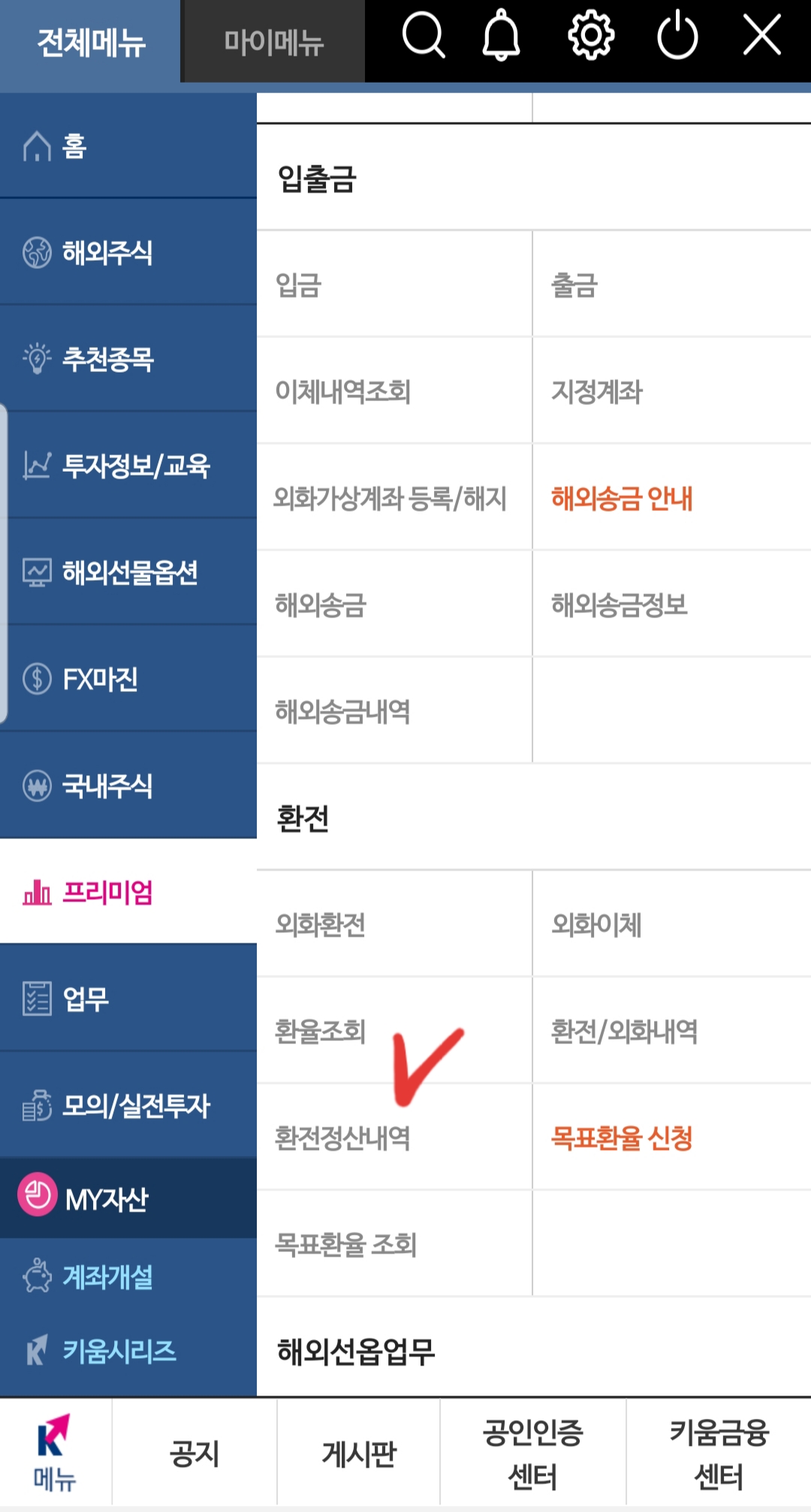 이게 제대로 들어왔는지 확인할 수 있는 방법이 있습니다. 환전>환전정산내역을 클릭하시구요.