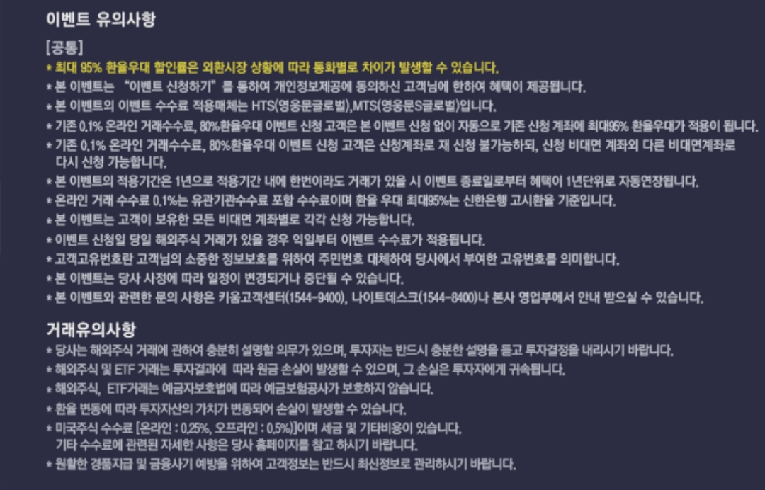 거의 마지막 즈음에 해외주식 수수료 0.1%, 환율우대 95% 해외주식 할인 이벤트라는 배너가 있습니다. 버튼을 클릭하시면 아래와 같은 화면이 보이는데요.