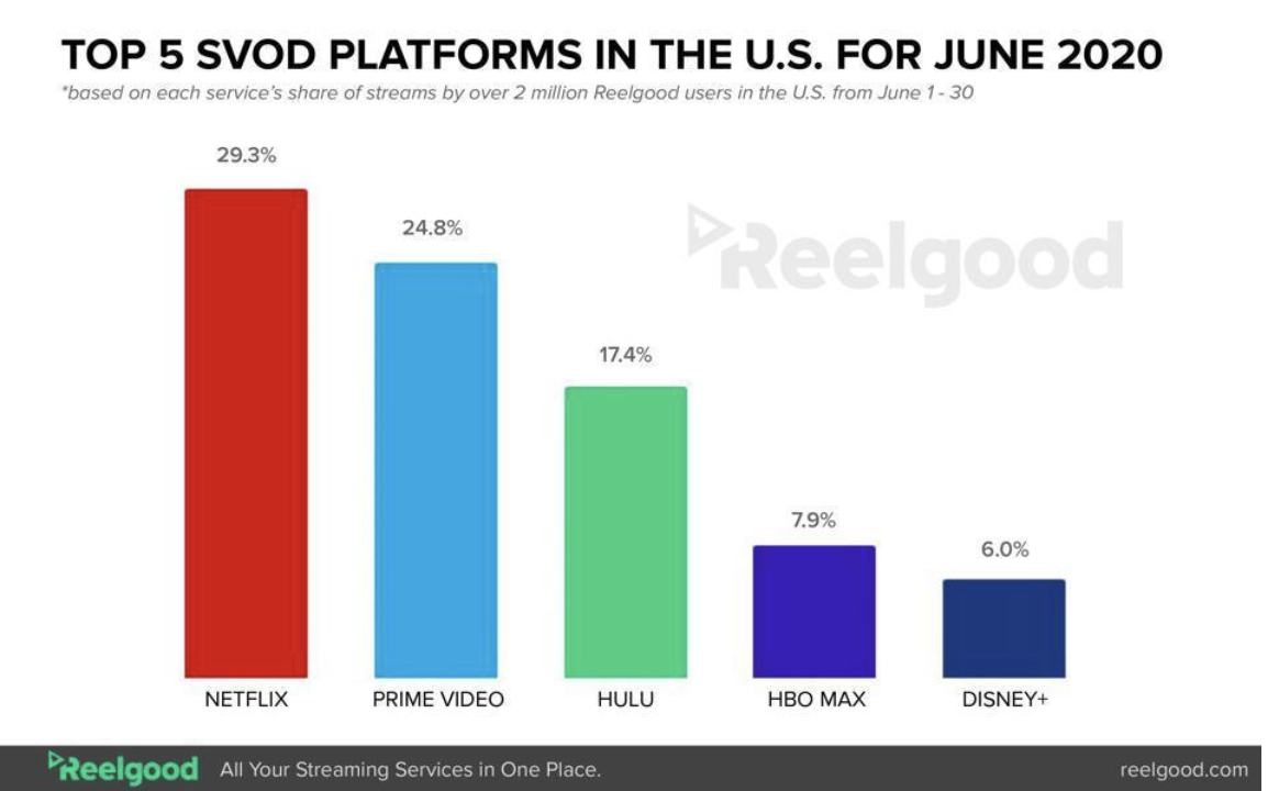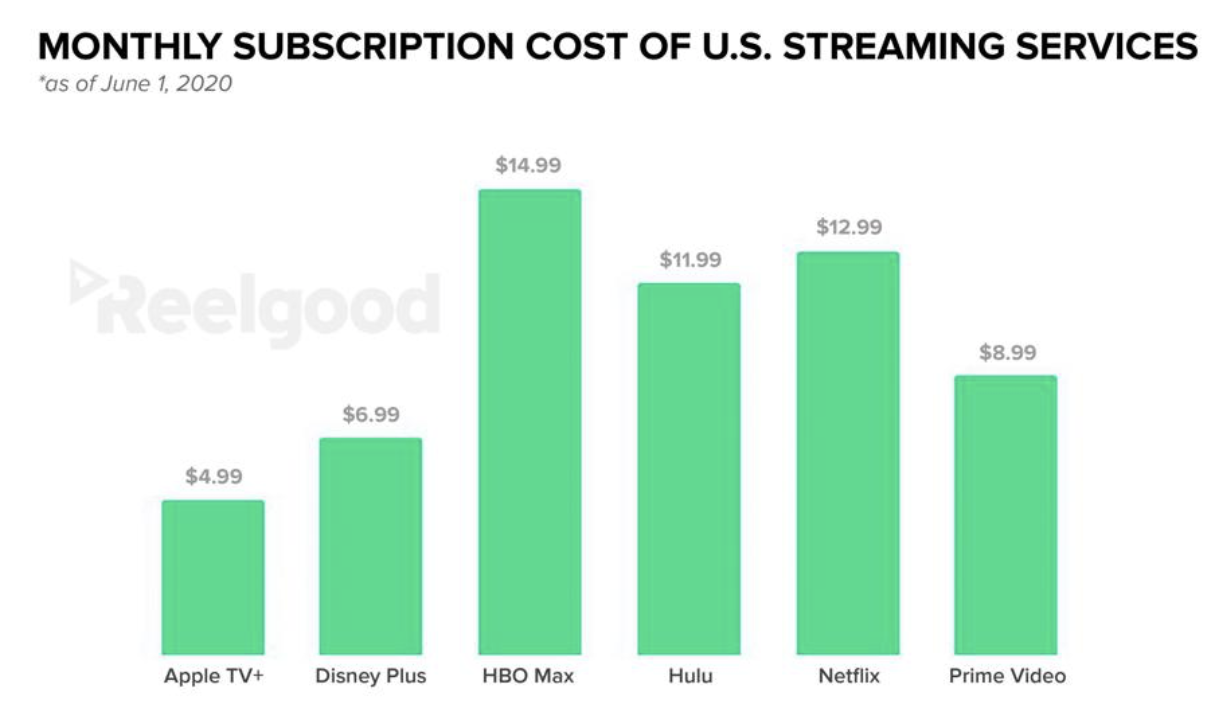 6월 기준 OTT 서비스의 월 구독료를 나타내는 그래프입니다. T의 HBO MAX가 가장 비쌉니다. 넷플릭스는 이미 많은 구독자를 보유했으니 이해가 가지만, HBO MAX는 사업 초기 단계에 단가가 높다고 느껴지네요. 그래서 그런지 최근에 1년 구독이 월에 11.99불로 구독 가능한 딜을 내놓았더라구요.