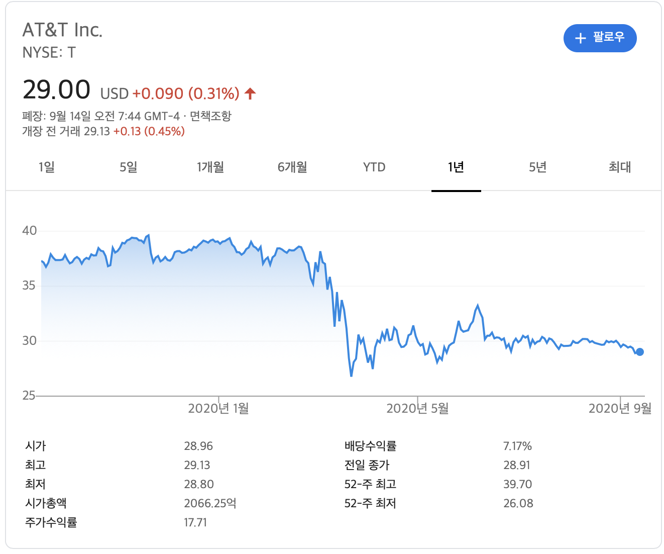 AT&T는 코로나 팬데믹 사태 이후, 35~40불 사이를 오가던 주가가 30불을 왔다갔다 하는 상황이고요. 배당수익률이 7.17%라는 점에서 배당주로서의 매력이 상당히 큰 종목입니다. 7%의 금리의 예금을 가입한다고 볼 수 있습니다. 게다가 분기별 지급이니 시간 가치를 따지면 7%보다 좀 더 높은 이자를 받는 셈이죠. 현재 주가가 낮아 배당수익률이 높은 것이니 주가가 상승하면 배당의 매력이 조금 하락하겠습니다만... 개인적으로 주가도 같이 올랐으면 합니다.