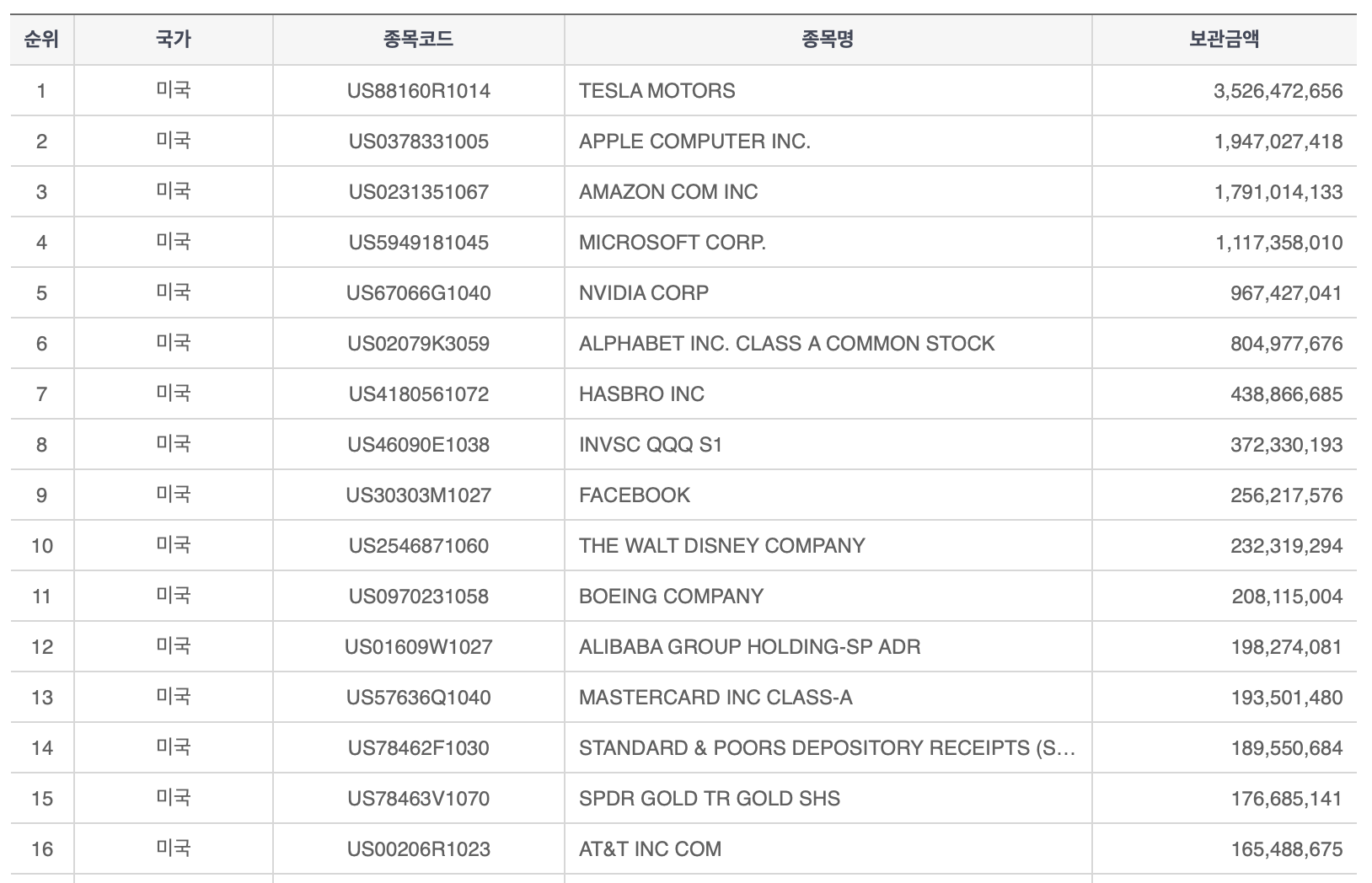 아래 표는 한국예탁결제원 기준(9월 11일자), 한국인이 보유하고 있는 미국 주식 종목 금액별 순위인데요. 테슬라, FAANG 등 기술주 뒤를 이어 16위에 랭크되어 있는 미국 대표 배당주 AT&T가 눈에 돋보입니다.