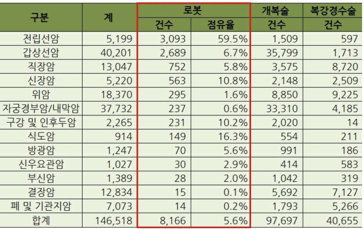 전립선암의 경우, 다빈치 로봇이 시술하는 건수가 3,093건으로 전체 전립선암 수술의 반 이상을 차지할 정도로 활용도가 높습니다. 전립선 수술 이외의 0-20퍼센트의 다른 수술도 사용될 여력이 있어 다빈치 로봇 생산 기업의 잠재력이 높다고도 볼 수 있지요.
