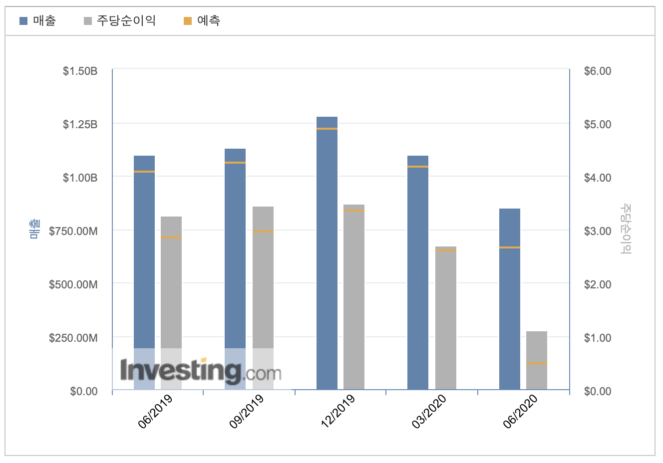 ◦ 2020년 2분기 매출 8억5200만 달러는 2019년 2분기 10억9900만 달러보다 22% 감소