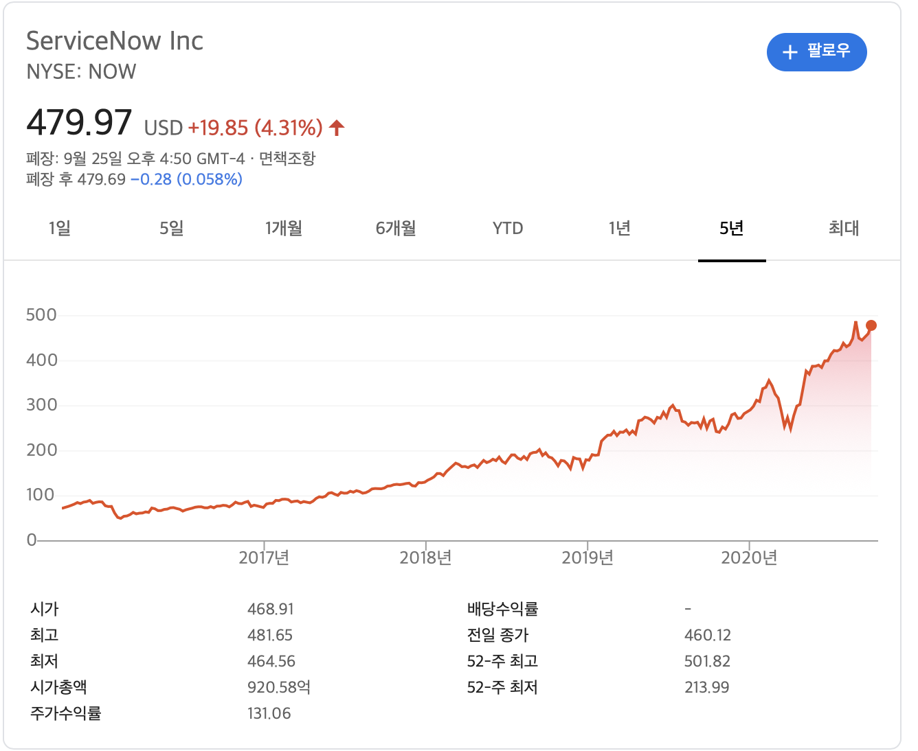다만 주의해야 할 점은 PER(주가수익률)가 131.06이라는 점인데요. 삼성전자 PER는 18.11, 애플의 PER은 34임에 비하면 지나치게 고평가 되어 있습니다. 테슬라는 PER가 1,048이던데 그보다는 한결 낫습니다. ITSM계의 애플이라는 타이틀을 거머쥐고 있기에 미래의 FAAMG이 될지는 좀 더 지켜봐야 되겠습니다. 저는 최근에 마이크로소프트와의 협력에서 매수버튼에 손이 가긴 합니다.ㅎㅎ