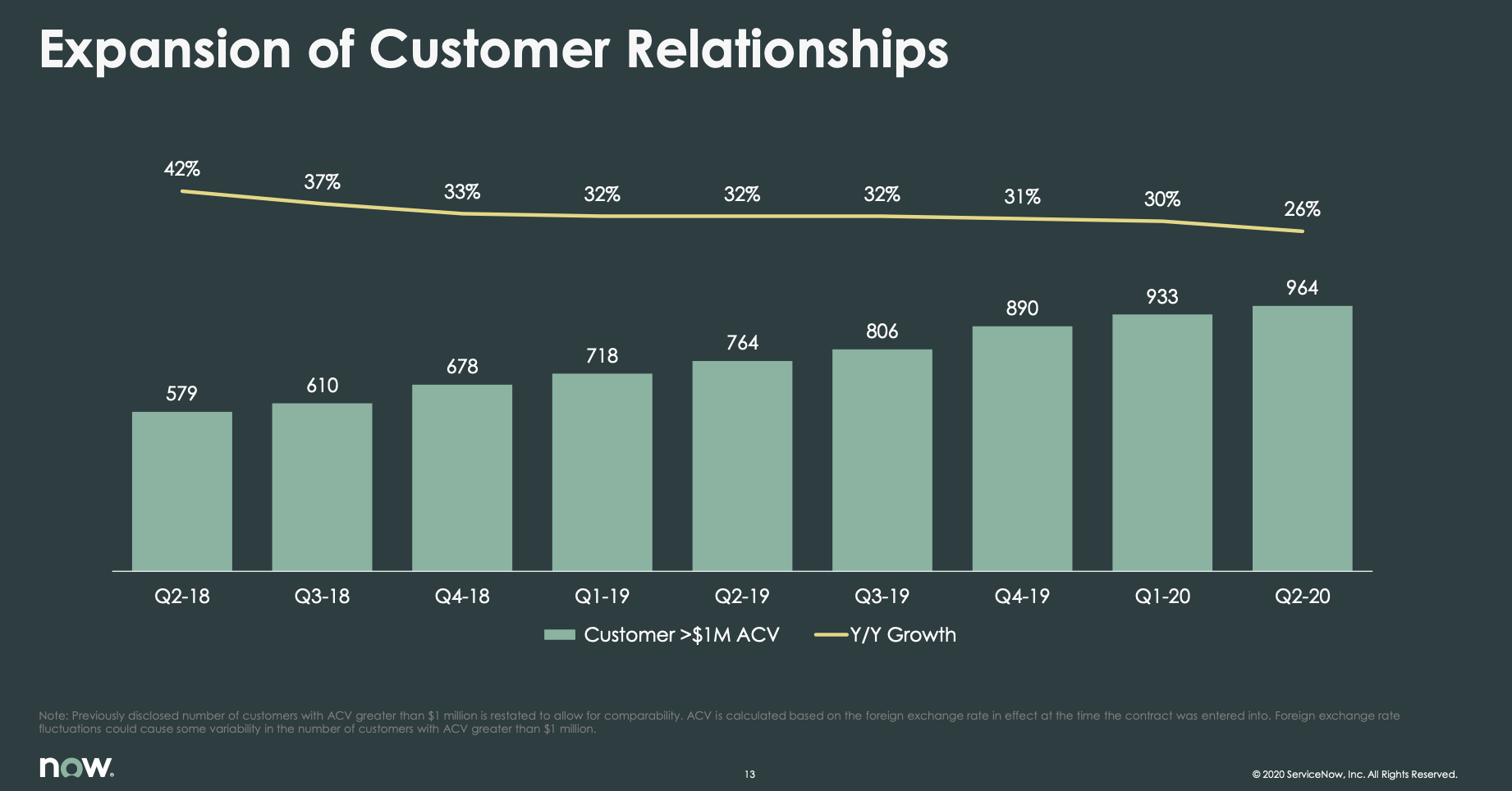 위 그래프는 100만달러 이상의 매출을 주는 고객 수를 보여주는 그래프입니다. 100만달러 이상을 ISTM에 쓰는 기업은 아무래도 대기업의 비율이 높겠습니다. 그만큼 리스크가 있어도 구독을 끊을 확률이 적은 안정적인 고객층이라고 할 수 있지요. 증가세는 점차 감소되는 추세이긴 하나, 고객이 늘고있긴 하기에 충성고객이 지속적으로 늘어나고 있다고도 봅니다.