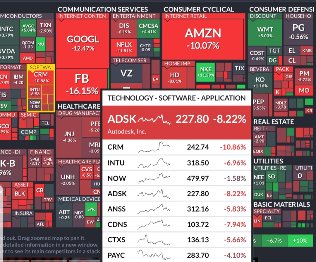 소프트웨어 섹터에서는 오토데스크와 세일스포스가 근 한 달간 하락률이 높고요. 며칠 전에 조회했을 때는 서비스나우가 하락률이 높았는데 그간 꽤 올랐나보군요.