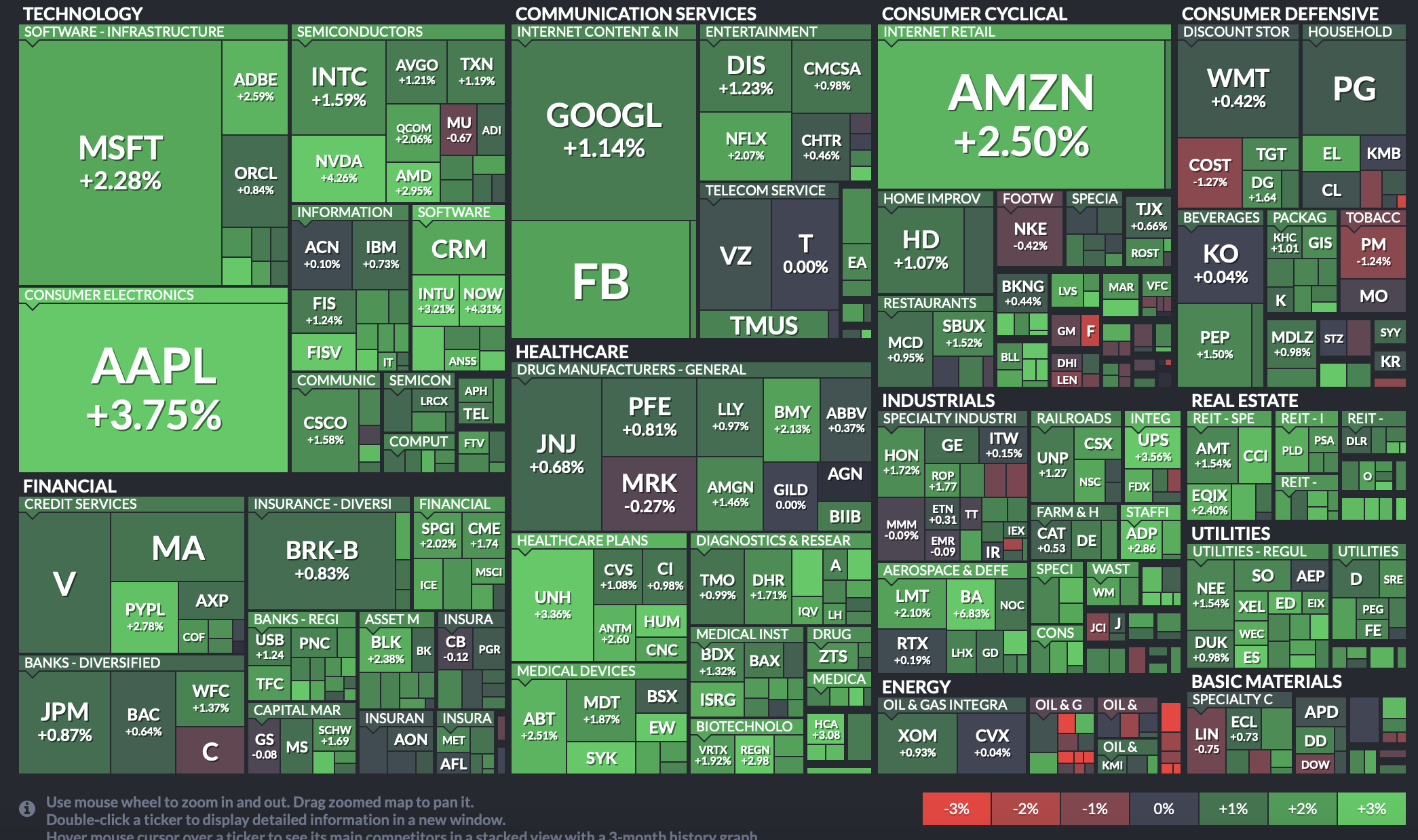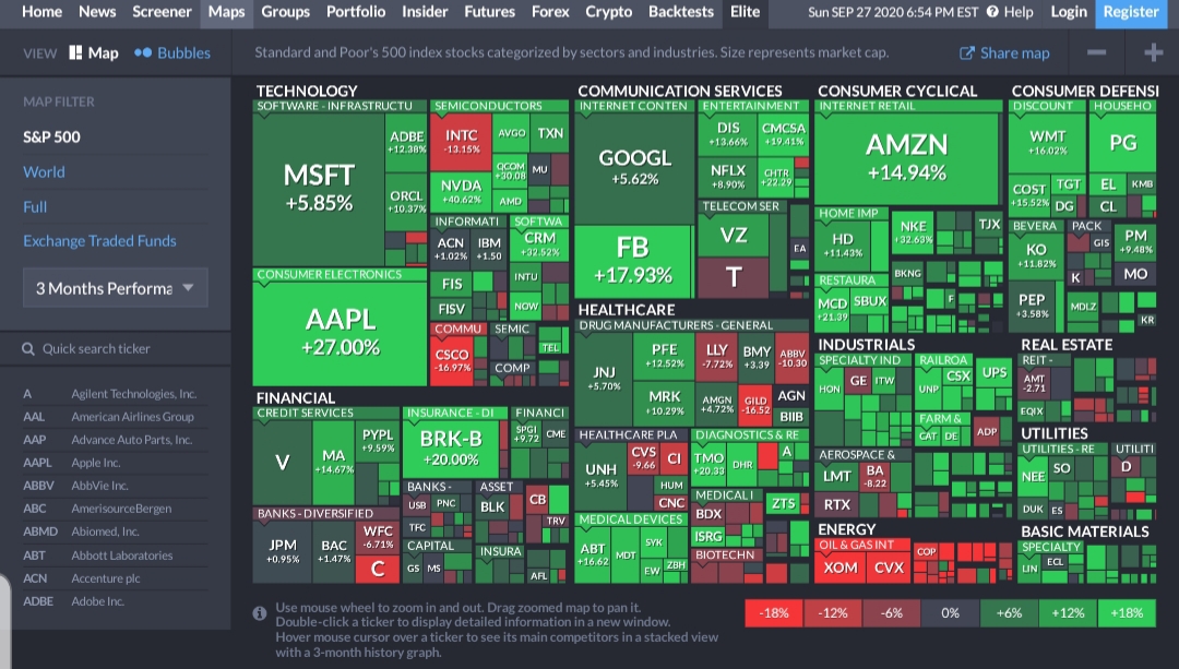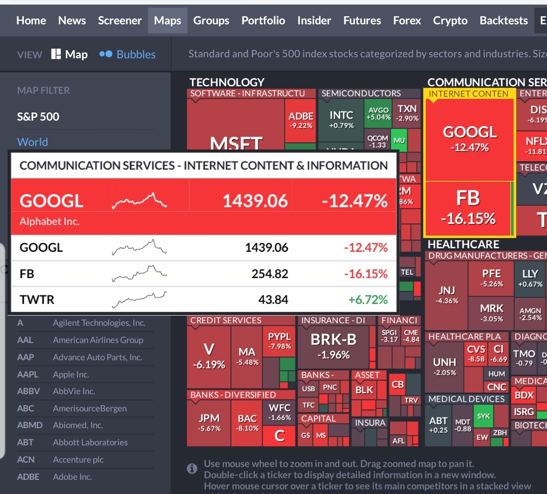 주식 티커를 직접 검색해서 주가 및 차트를 확인하는 기본적인 기능부터해서 cnbc나 yahoo finance처럼 최근 뉴스도 확인할 수 있고요. 다만 가독성이 많이 떨어져서 저는 뉴스는 타사이트에서 확인하고 Maps에서 트리맵만 보고 있습니다.
