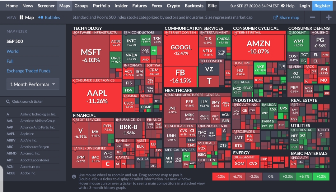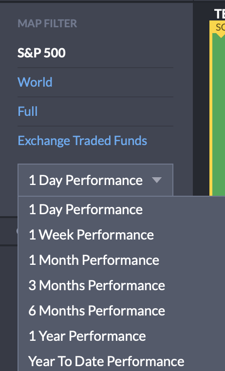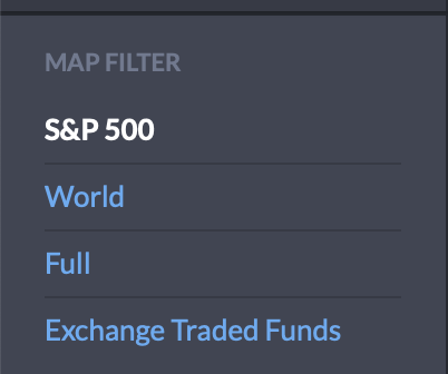 MAP탭을 클릭하시면 좌측에 map filter 기능이 있는데요. 기본적으로 현시되는 트리맵은 S&P 500 지수 기반이구요. 전세계의 주식시장을 보고 싶으시면 World, 미국 주식시장 전체를 보고 싶으시다면 Full, ETF시장을 보고 싶으시면 Exchange Traded Funds를 클릭하시면 됩니다. 참고로 테슬라는 S&P 500 지수에 편입이 되지 않았기 때문에 Full로 보셔야합니다.
