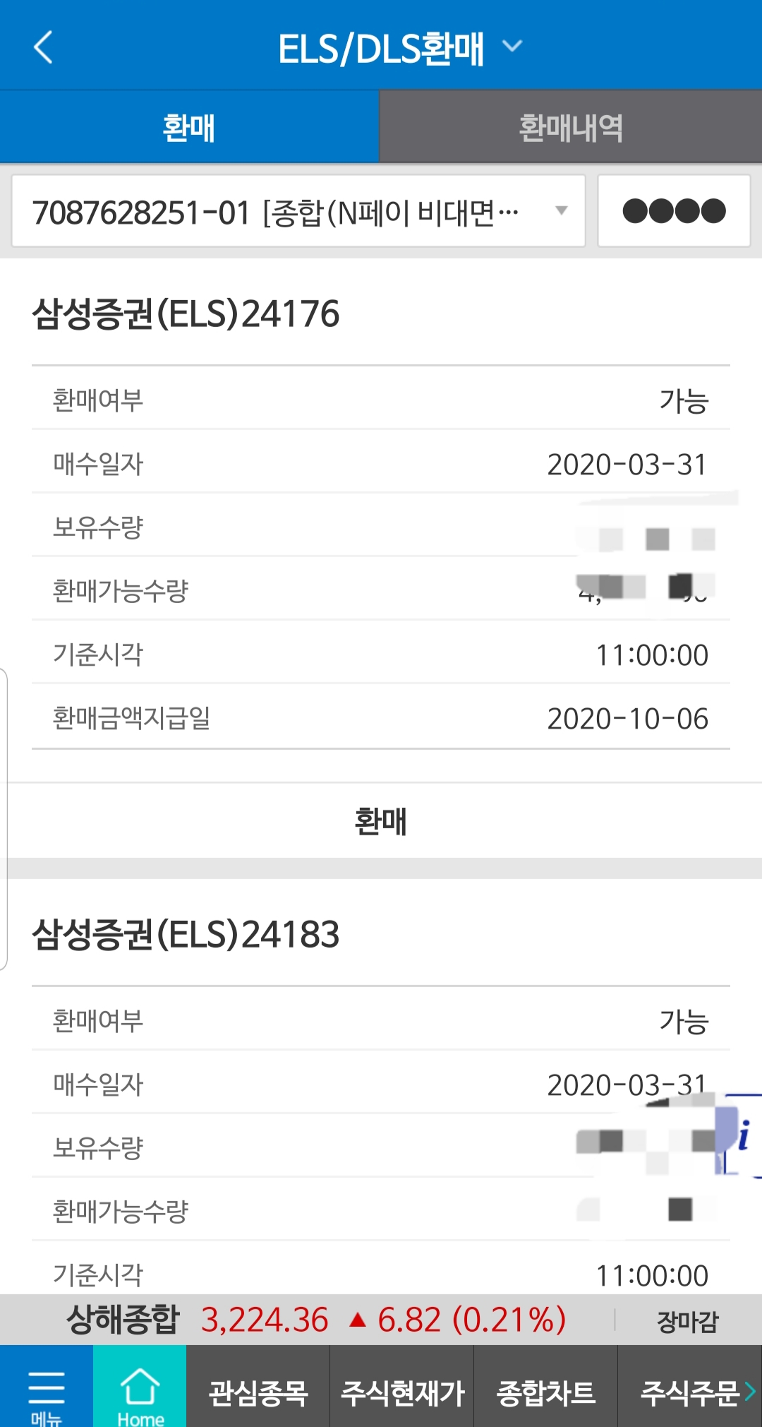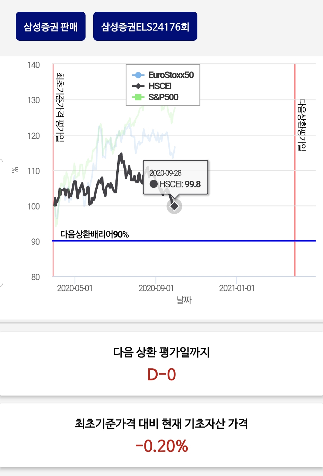 3월달에 코로나 때문에 주가가 폭락하면서 ELS 쿠폰 이자가 높아졌을 때 ELS를 줄줄이 가입했는데요. 금일이 조기상환평가일인 ELS는 총 3개였습니다. 6개월 전 날짜인 3월 28일에 가입하지 않았지만 추석연휴로 인해 3월 30일과 4월 3일에 가입한 ELS도 오늘 조기상환평가를 하더군요.