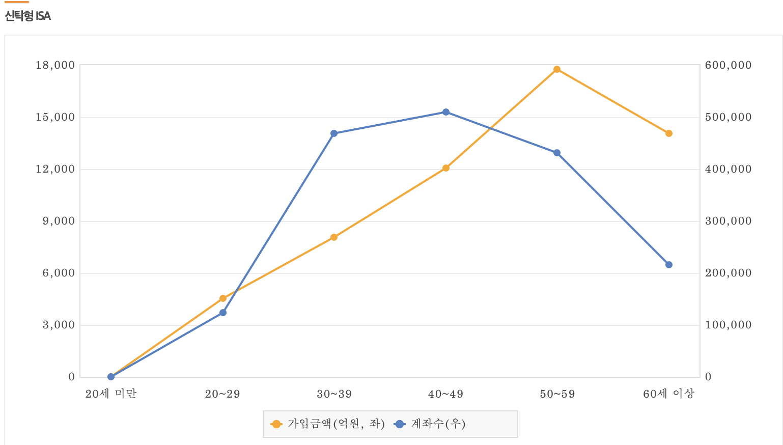 제가 생각하기에는 여유자금이 있으신 5060 연령대 분들이 절세+자산배분 차원에서 가입하는 상품이 아닐까 생각했었는데 역시나군요. 은행/증권사에서 영업하는 일임형 ISA가 아닌 신탁형 ISA 현황을 보면 5060 세대의 가입금액이 많습니다.