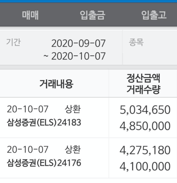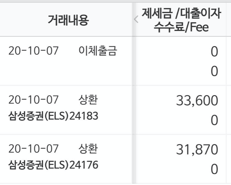 9월 29일자가 상환평가일이었지만 추석과 개천절 연휴로 인해 10월 7일에서야 계좌에 상환금액이 입금되었습니다!!!(짝짝짝!!) KB증권 els도 상환되었지만 모바일 어플리케이션 보안상 캡처가 되지 않아 삼성증권 ELS만 캡처해보았습니다.