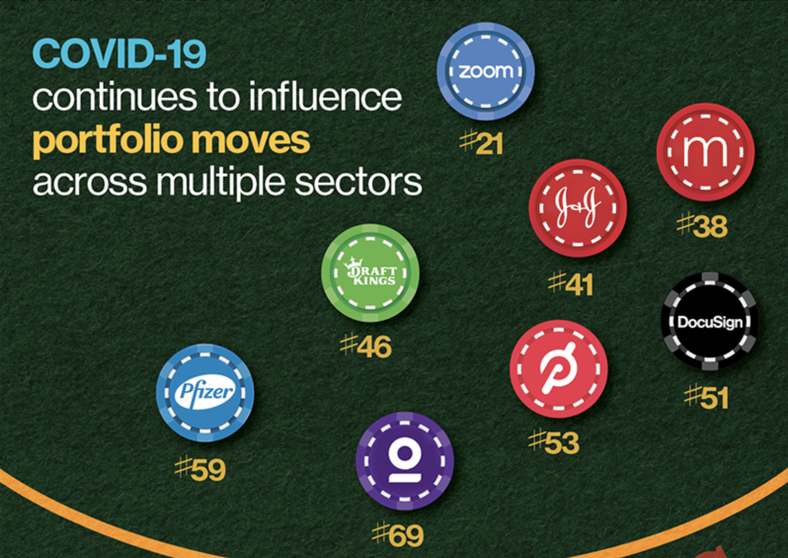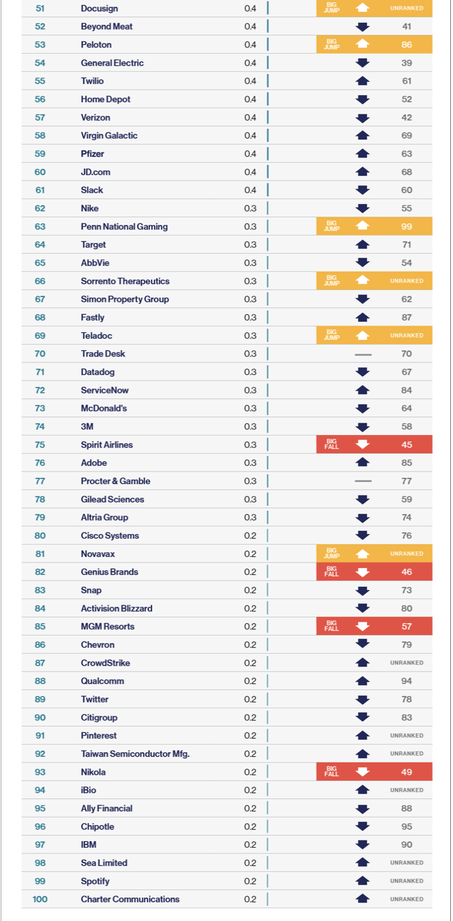 그 외에도 코로나 창궐 이후 언택트로 수혜를 입었던 종목들이 여전히 매수세를 보이고 있습니다. 줌(Zoom)은 무려 17계단 상승한 21위, 온라인 도박 업체 드래프트킹스(65->46위), 펠로톤(53위)입니다. 전자 서명 기업인 도큐사인과 텔라닥은 지난 분기에 100위 안에 들지 않았지만 이번 준기에 각각 51위와 69위에 랭크되었습니다. 코로나19를 극복하려면 좀 더 긴 호흡으로 바라봐야 한다는 스탠스를 가지고 있는 듯 하네요.