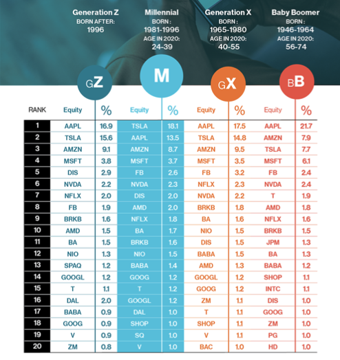 미국 디지털 자산 관리 업체인 에이펙스 클리어링(Apex Clearing)은 분기별로 개인투자자들의 매수 주요 상위 종목 순위를 매겨 리포트를 발간합니다. 밀레니얼 세대, 베이비부머 세대, X세대, Z세대로 구분하여 각 세대별로 매수한 종목 20위를 비교하여 발표하는 것이 특징입니다.