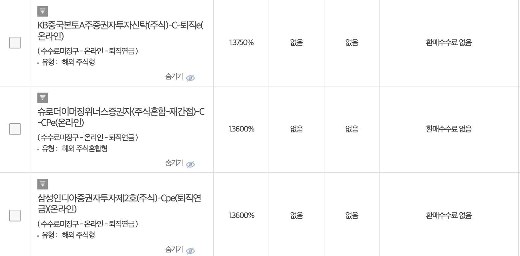 삼성증권->퇴직연금->펀드 상품 중에서 주식 비중이 담겨있는 혼합 펀드들의 수수료를 확인해보았는데요. 1.3%대의 수수료를 형성하고 있습니다. 물론 삼성증권만 그런 것이 아니고 타 증권사 모두 혼합 펀드의 수수료는 비슷한 수수료 비율을 형성하고 있고요. 펀드 운용하시는 분들의 노고에 당연히 수수료를 지불해야하는 건 타당하지만 증권사가 왜 퇴직연금을 그렇게나 홍보하는지 알만한 대목이지요...^^