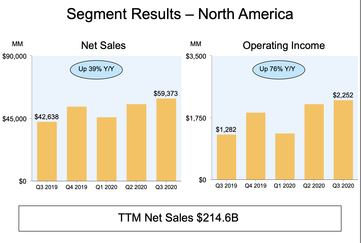매출액 역시 꾸준히 증가하는 양상을 보이고 있습니다( 최근 4분기 실적을 합한 값으로 계산한다는 의미가 TTM). 클라우드(AWS)업과 전자상거래, 소매 판매 등을 북미, 해외로 구분하여 원형 그래프를 보여주는데요. AWS의 매출액이 계속해서 증가하고, 전세계 클라우드 시장의 1위를 차지하고 있으나 아마존은 여전히 소매판매업에서 매출의 대부분을 차지하고 있습니다. 해당 비중은 2020년 1분기, 2분기나 별 차이가 없음을 확인하였습니다. 카테고리별 매출액, 영업이익을 살펴보겠습니다.
