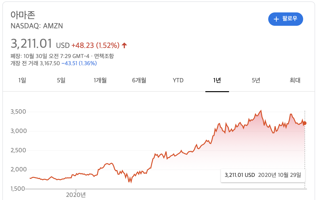 아마존은 10월 29일 3,211.01달러로 마감했지만 실적 발표 이후에 1.36% 하락한 3,167.50불로 장전 거래되고 있습니다. 미국 대선과 코로나19 재확산으로 인한 불확실성이 겹쳐져 향후 주가의 향방 역시 불확실한 상황입니다.