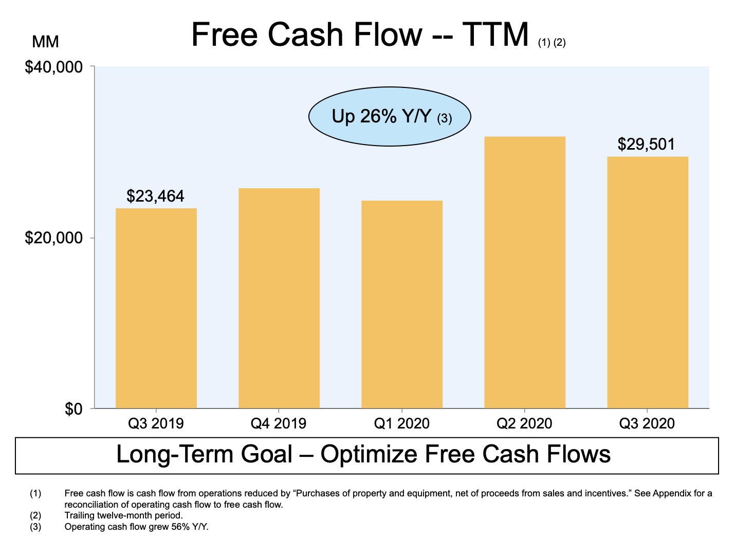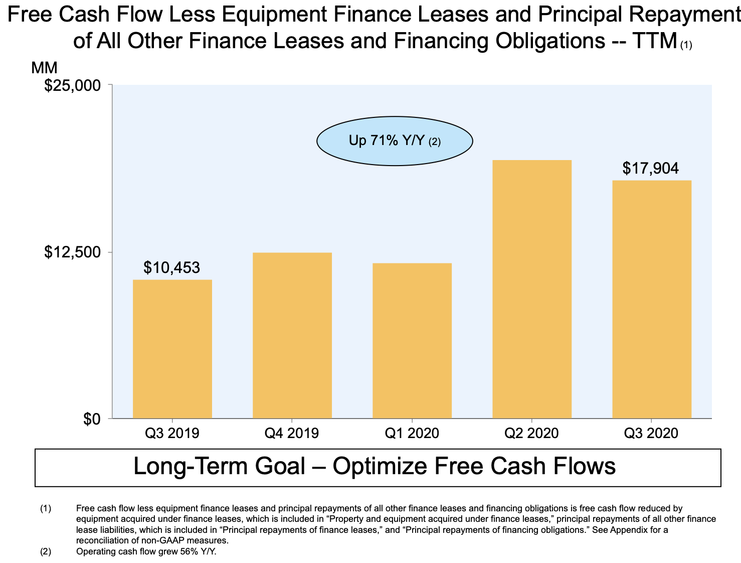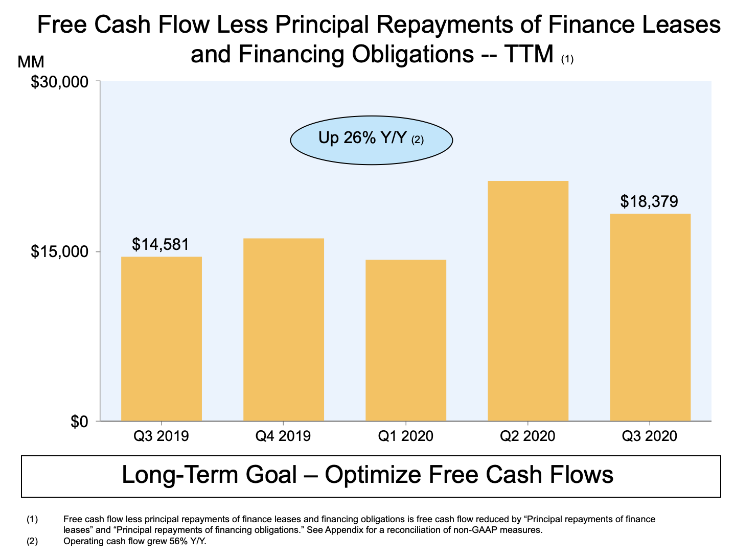 전년도 3분기 잉여 현금 흐름인 235억 달러와 비교하면, 올해 3분기는 295억 달러로 약 26% 증가하였습니다. 필요장비 구매를 제하고 남은 현금흐름을 의미하고요. 이에 원리금 상환과 같은 금융 의무까지 제하고 남은 현금은 183억 달러로 전년 대비 26% 증가하였습니다.