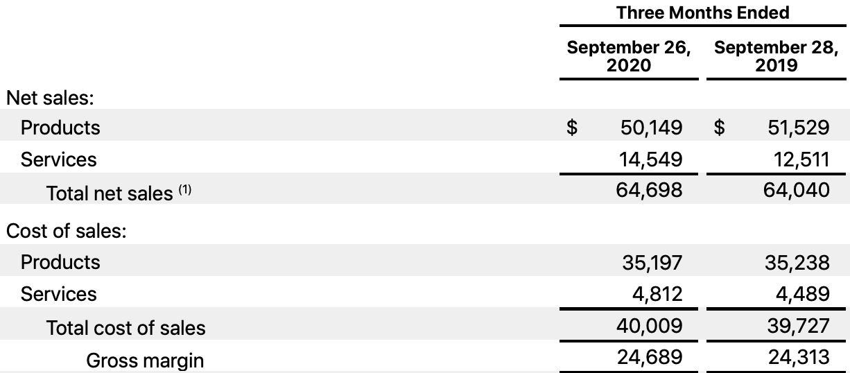 이번 실적 발표 자료를 캡처한 것인데요. 2020년 3분기 기준으로 기기를 판매해서 501억 불의 매출을 기록하였습니다. 기기 판매, 제작에 따른 원가가 351억 불이니 기기를 팔아서 손에 남는 돈은 150억 불이네요.