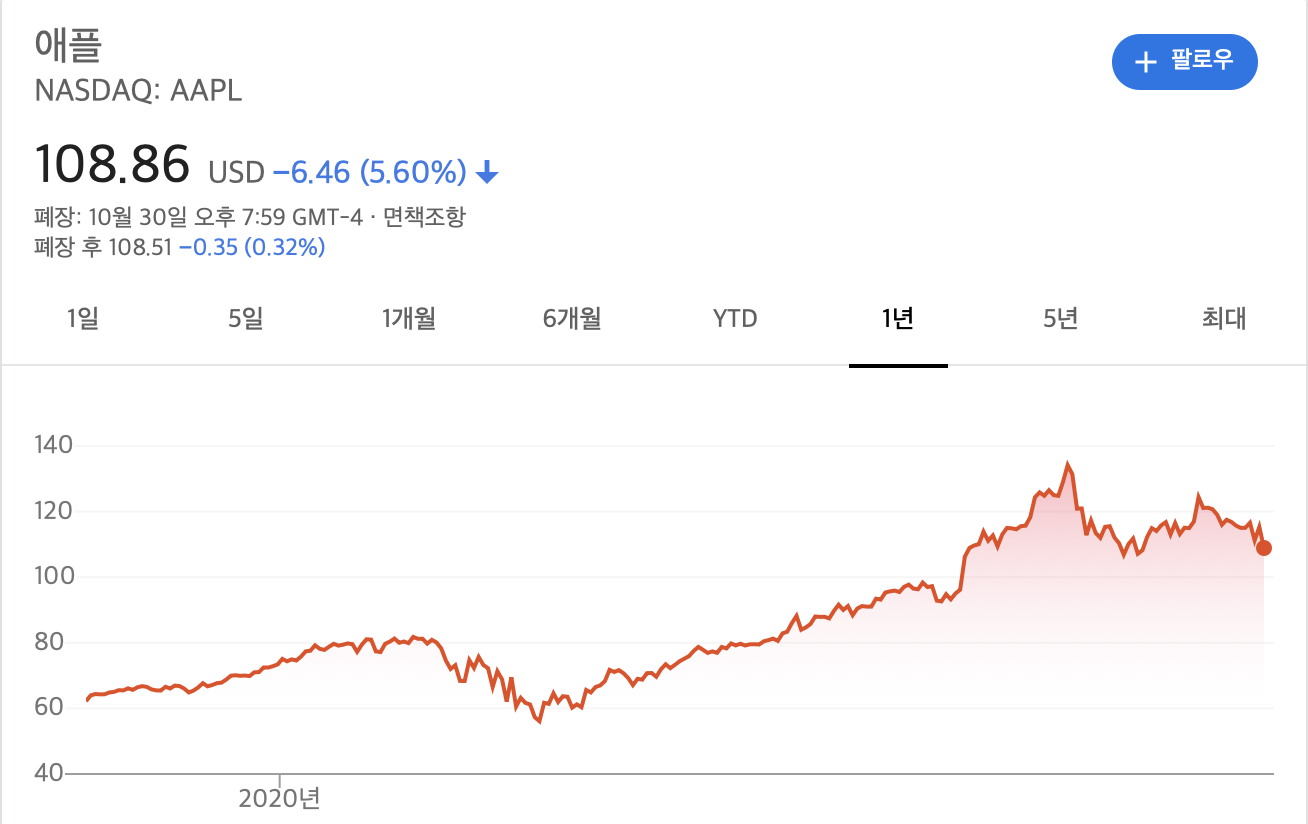 애플은 10월 29일 실적 발표 이후, 10월 30일에는 108.86불로 마감했는데요. 137불에 육박했던 주가는 미국 대선과 코로나19 재확산으로 인해 하락을 면치 못했다가 실적발표 이후, 급락하고 있습니다.