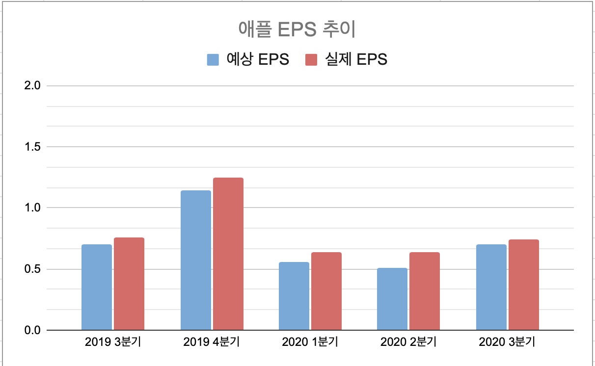 위 그래프는 파란 막대그래프가 예상 EPS, 빨간색 막대그래프가 실제 EPS로, 분기별 실적을 나타내는데요. 확실히 전반적으로 올해보다 작년 실적이 좋긴합니다. 그럼에도 불구하고 2분기에 주가가 폭발적으로 증가했던 요인은 액면분할 이슈와 어닝 서프라이즈가 요인이었다고 생각합니다. 3분기에는 어닝 서프라이즈도 아닌 예상했던 대로 돈을 벌어왔다고 보시면 될 것 같습니다. 예상했던 바에 비해서 살짝 좋은 수치이긴 합니다만 시장의 기대치가 워낙 높아야지요~
