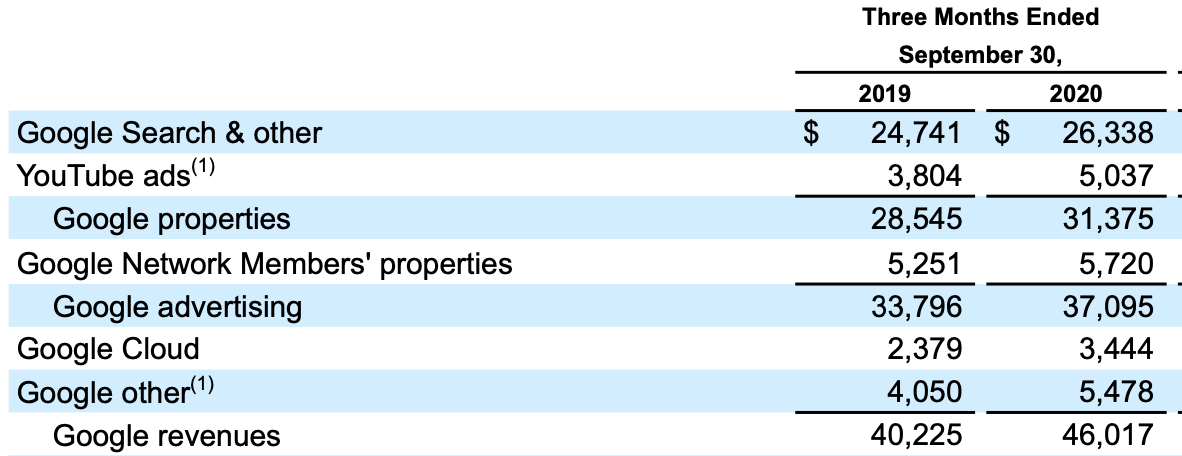 알파벳은 순다 피차이 CEO 체제로 들어선 후 2020년 2월 처음 유튜브 실적을 공개하였는데요. 이는 2006년 구글이 유튜브를 인수한 이후, 처음있었던 일이라고 합니다. 올 3분기에도 어김없이 유튜브 실적을 보여주었습니다. 구글은 크게 구글 광고, 구글 클라우드, 구글 플레이 등 기타 구글로 분류되는데요. 구글 광고에는 구글 자체 플랫폼인 구글 검색 엔진과 유튜브 광고, 제휴 사이트 광고로 구분됩니다. 그에 따른 매출은 아래와 같습니다.
