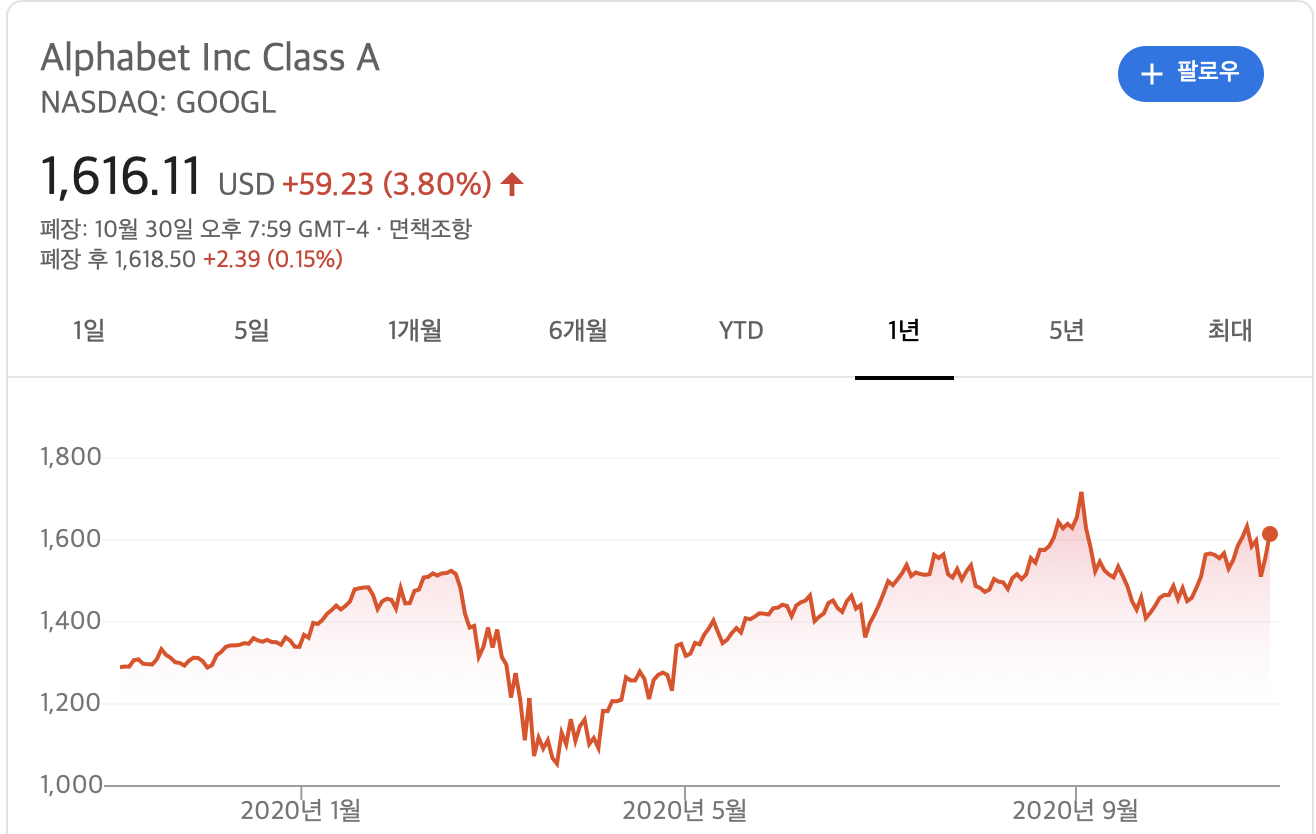 다만 다른 빅테크 기업과 달리 코로나 전 주가를 가뿐히 넘은 편은 아니라서 기존 주주 입장에서는 아쉬운 주식일 수도 있겠지요. 알파벳의 연초 이후 주가상승률은 16.2%에 그쳐 같은 기간 페이스북 36.8%, 넷플릭스 44.2%, 애플 55.3%, 아마존 60.0% 상승한 것에 비해 저조한 수준입니다.