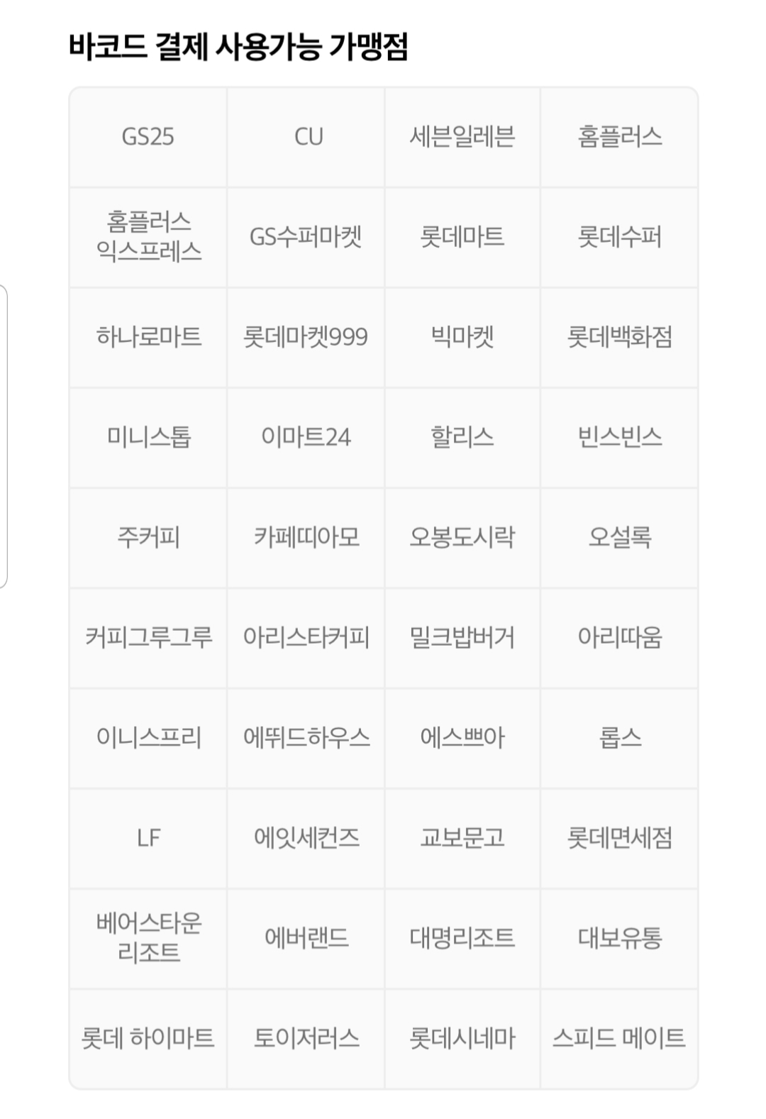 참고로 주의할 점은 바코드 결제가 되는 업체에서 적용가능하다는 점! 바코드 결제 사용가능 가맹점은 하단 이미지에서 확인 가능하십니다. 편의점부터 롯데 유통업체 라인, 카페까지 다양하지만 바코드 결제가 보편화된 편의점에서 사용하시는게 편하실 겁니다. 바코드 결제는 리브메이트>간편결제 탭에서 하실 수 있어요.