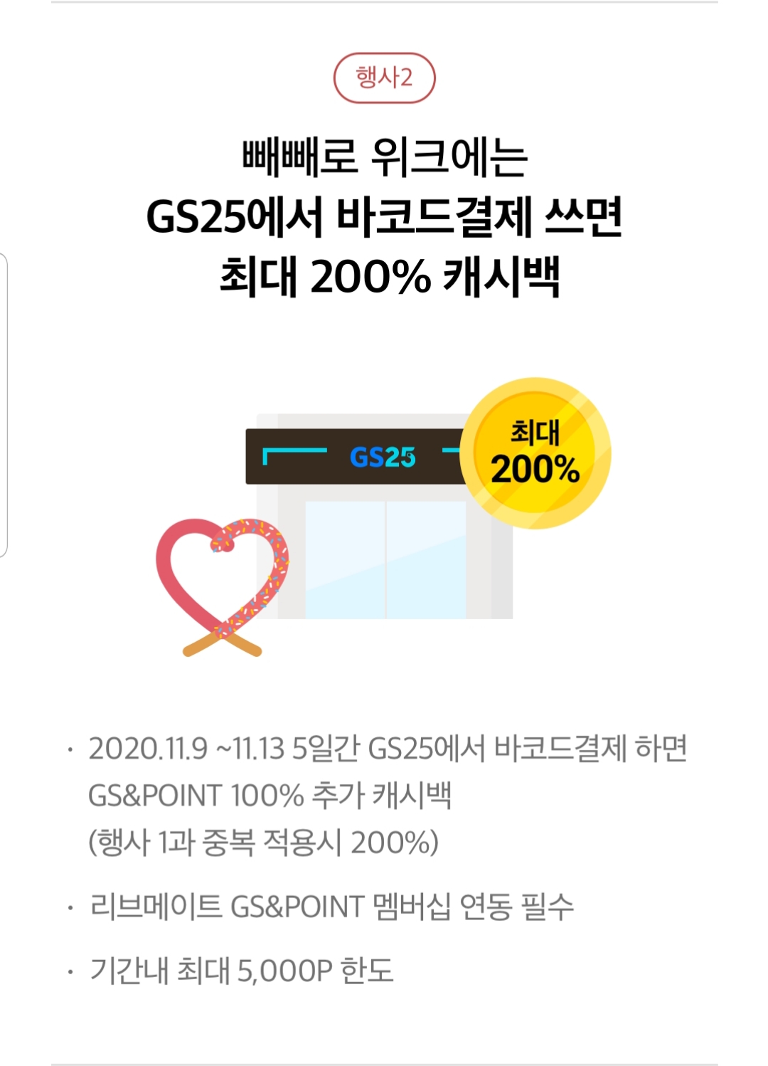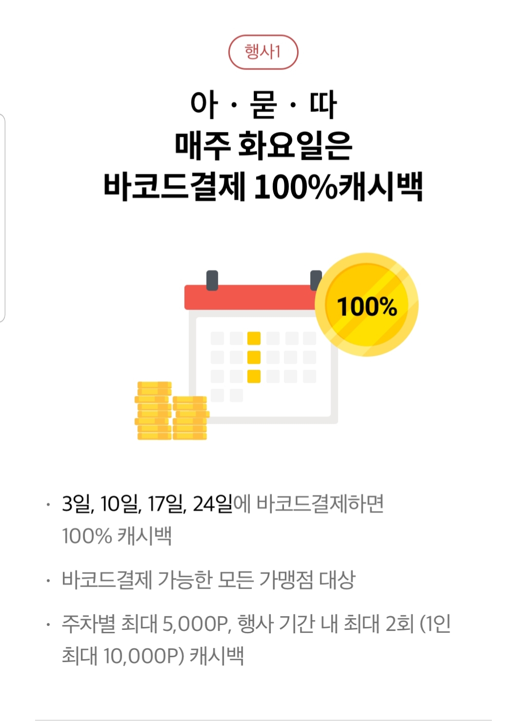 이 행사는 GS25와 제휴 이벤트인 것 같습니다. 9일부터 13일까지 GS25에서 바코드결제를 하면 5000p까지 캐시백을 해주는데요.