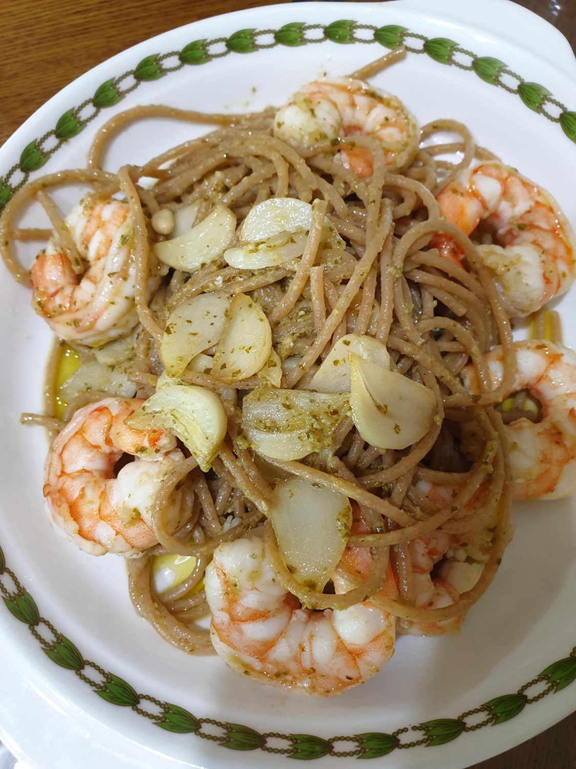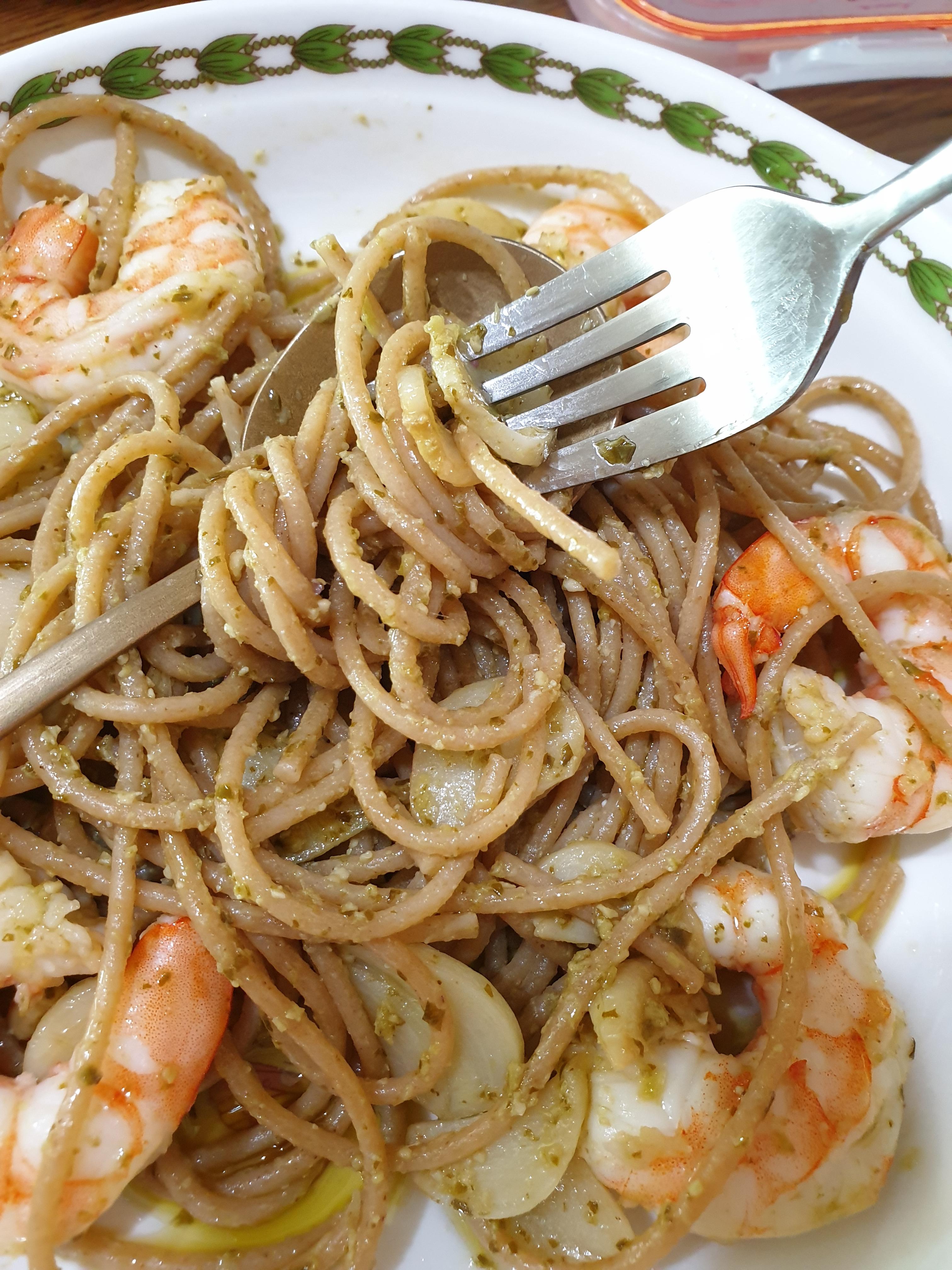 간은 소금을 넣지 않았는데도 적당히 맞았습니다. 사실 바질페스토 안에 간이 잘 되어 있기 때문에 소금을 따로 치거나 하지 않았어요. 일단 면수를 넣으면 면수에 소금 간이 되었기 때문이에요. 마늘도 타지 않고 익힘정도가 적당했고, 새우도 통통하니 식감이 좋더군요. 파스타면은 일반 파스타에 비해 거칠긴 했지만 소스는 잘 배어 있어서 맛있게 먹은 한 끼였답니다.