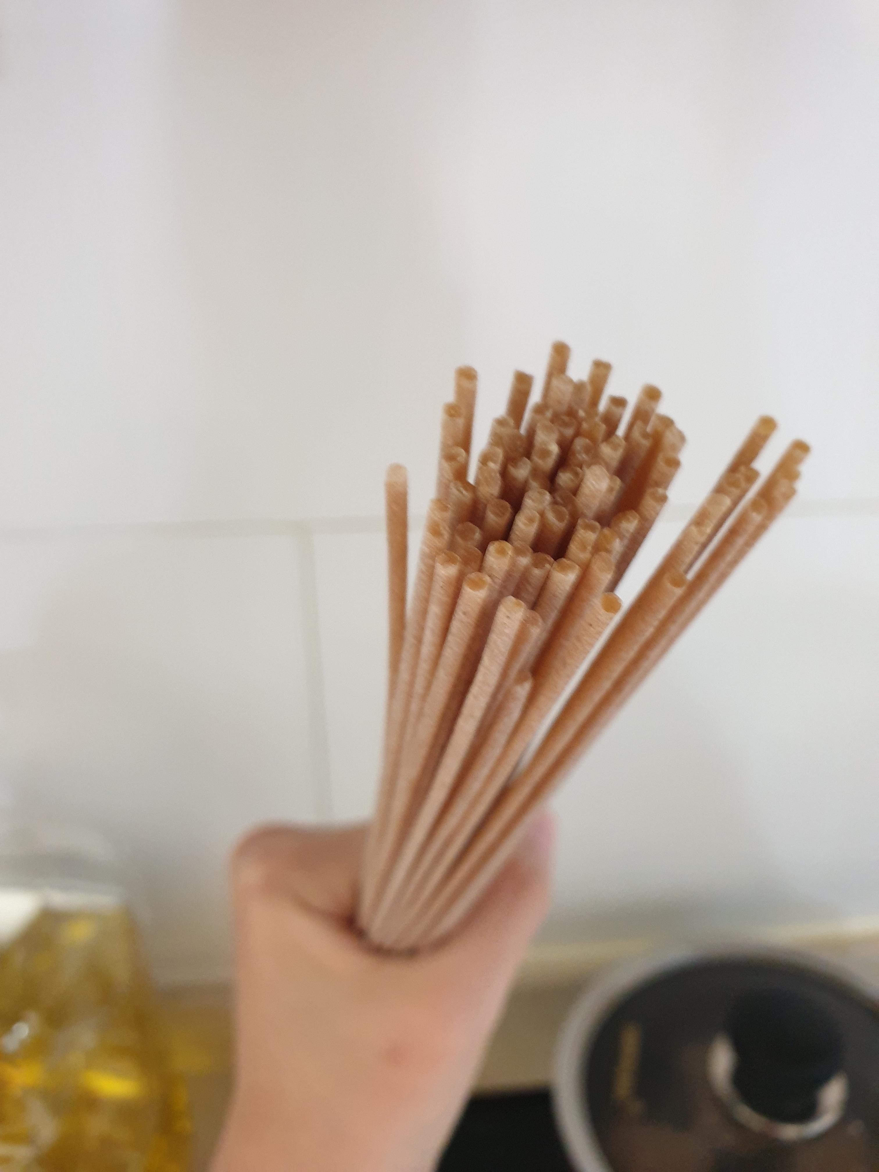 파스타면은 미주라 통밀 파스타면을 사용했는데요. 제가 산 건 아니고 집에서 한번 먹어보고 맛없다고 구석에 박혀있는 파스타였어요. 통밀을 사용하여 식이섬유가 일반 파스타면에 비해 풍부하고 비교적 건강한 면이라고 하는데요. 식감이 확실히 거칠고 양념이 덜 스며들기 때문에 가족들은 안좋아하더라고요. 저는 나쁘지 않아서 혼자 먹으니 미주라 통밀파스타면을 활용했습니다. 팜오일, 해바라기유, 올리브유도 들어가지 않아 식단관리를 하시는 분들게 적절하지 않을까 싶어요.