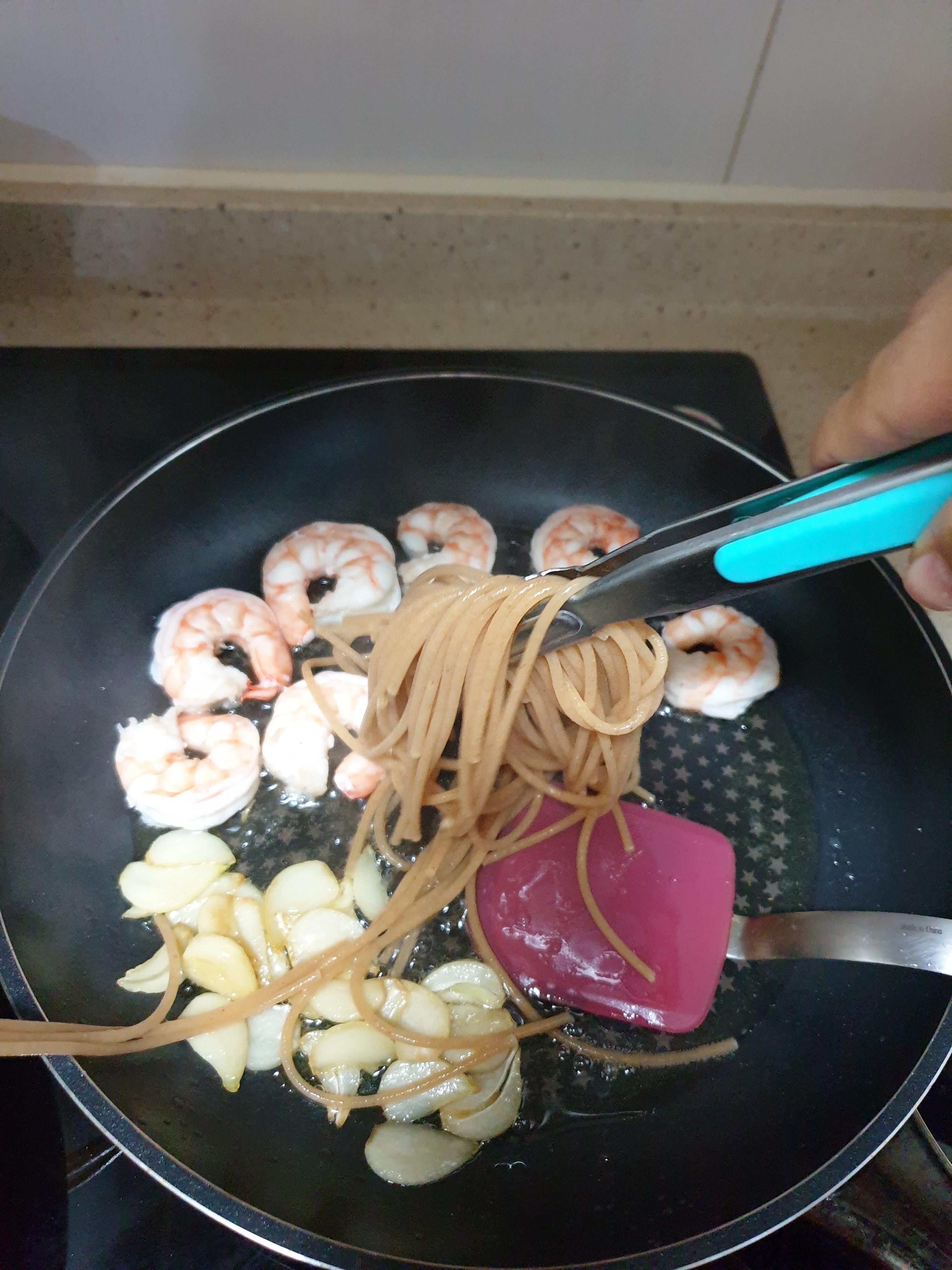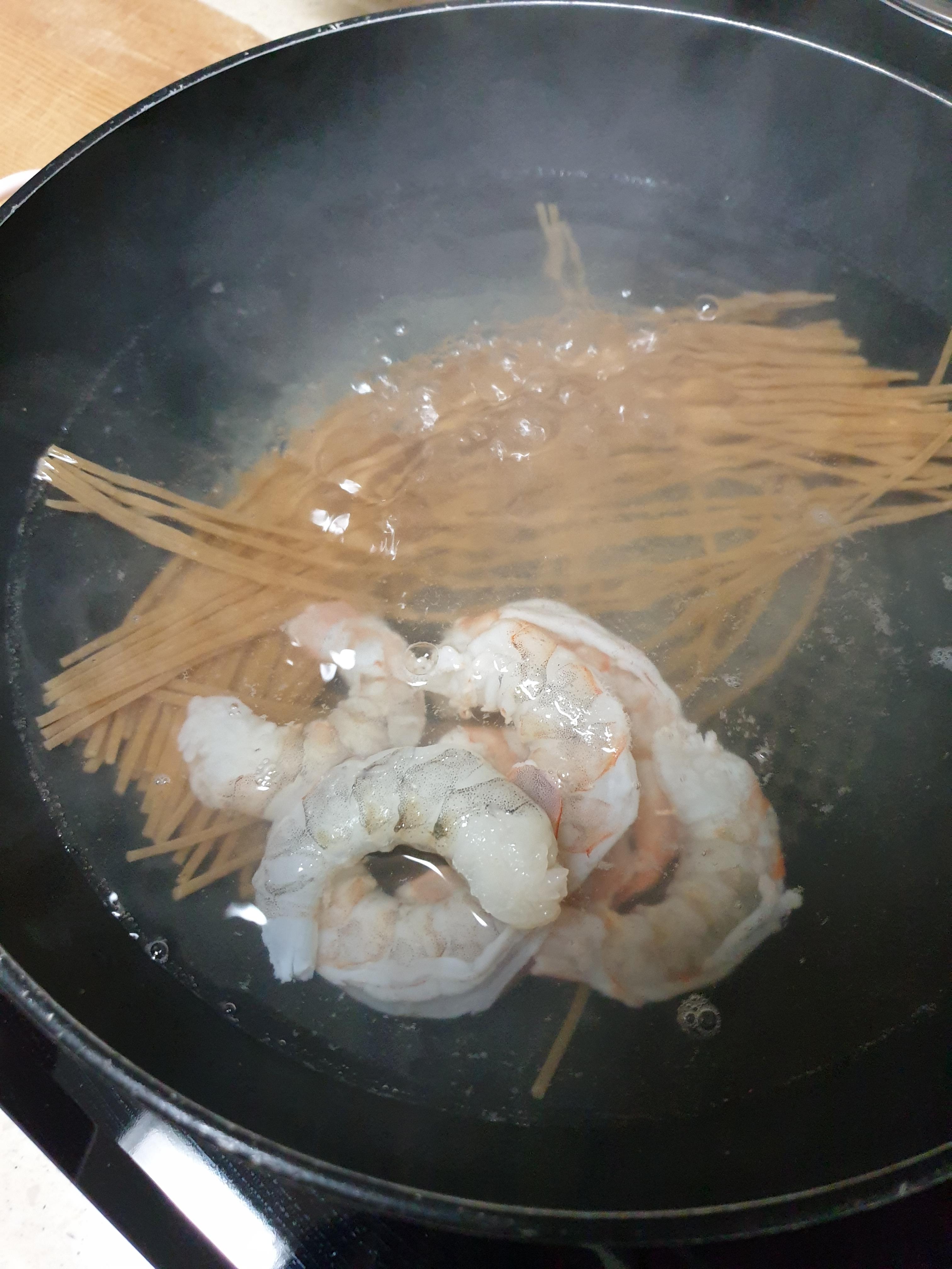 물이 끓어 파스타면 1인분 양을 넣어주었고, 면수에 간을 맞추기 위해 굵은 소금을 반큰술 정도 넣어주었답니다. 새우는 기름에 넣어 볶아줘도 되지만 저는 끓는 물에 짧게 데쳤습니다. 알덴테는 이탈리아에서 선호하는 방식으로 씹는 식감이 느껴질 정도로 삶아낸 정도인데 미주라 통밀 파스타면 기준으로 9분이라고 해요. 지난 주말에 알덴테로 페투치니면을 먹었다가 호되게 당해서.. 10분을 타이머로 해두고 삶았습니다.