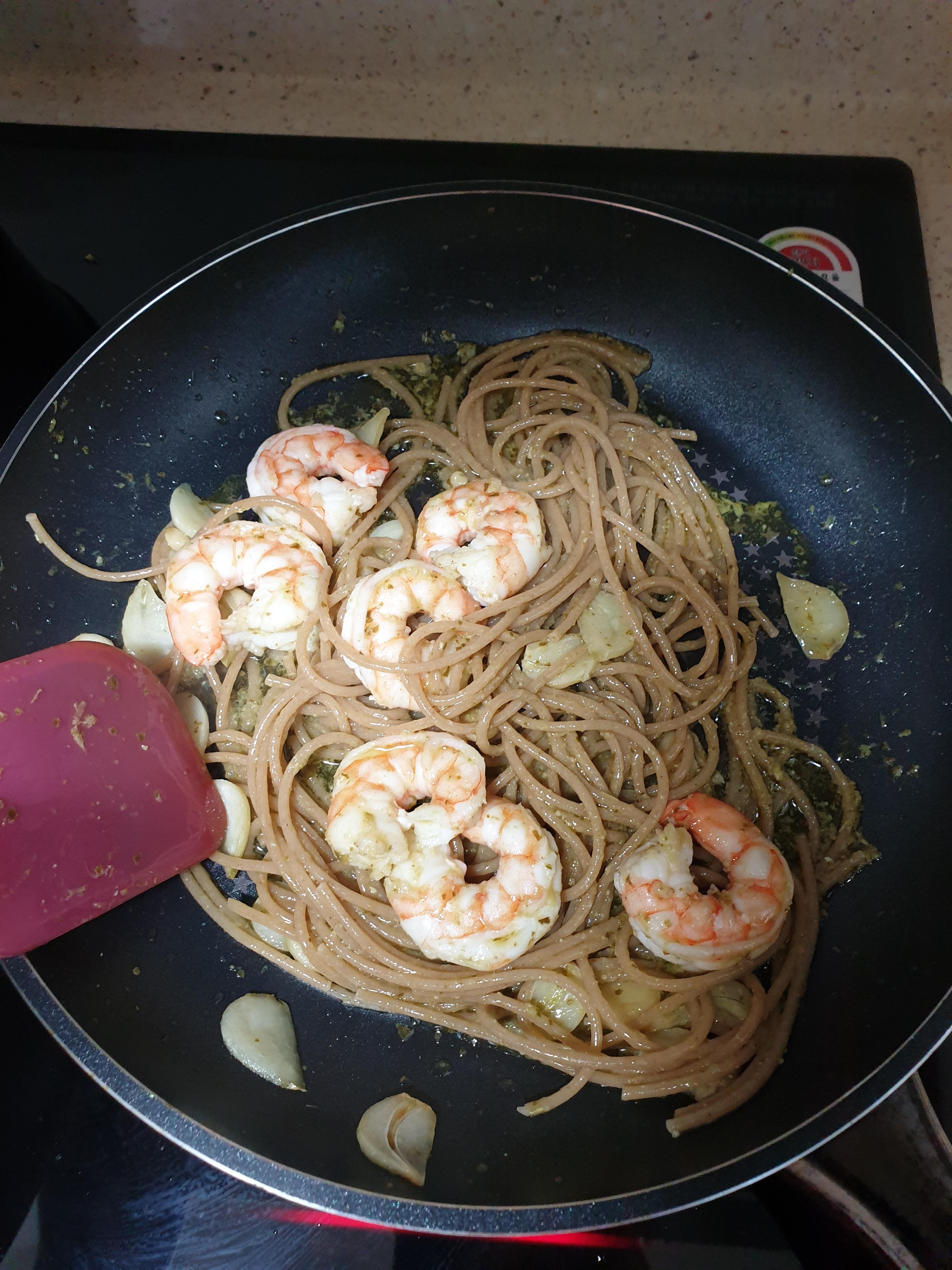마늘을 볶은 팬에 새우를 넣고 30초 정도 기름에 달궈주시구요~ 10분이 되면 파스타면과 면수 한 국자를 넣고 볶아주세요. 수분이 날아갈때 즈음에 필요한 재료는 바로 바질페스토입니다!