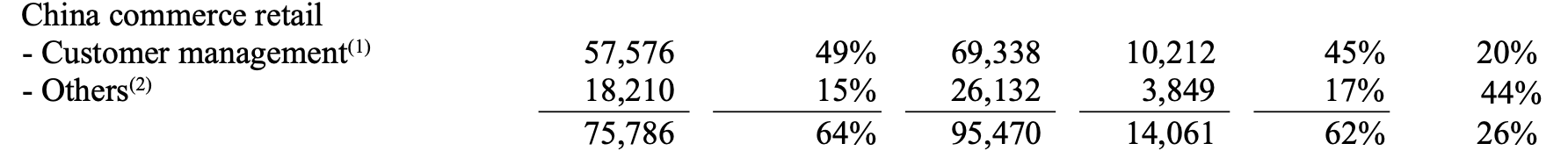 중국 소매 판매업 중에서도 Customer manaement는 기존에 있었던 타오바오몰에서의 매출이고, Others는 Tmall 수퍼마켓, prechippo, Intime 등 신규 유통 비즈니스에서 온 매출이라고 보시면 됩니다. 정통적인 웹사이트에서의 증가율은 그렇게 크지 않지만, 새로운 유통 비즈니스에서의 증가율은 44%에 달하네요. 44%라고 해서 마냥 높다고 보시면 안되는게, 중국 내의 경쟁 기업 징둥, 핀둬둬 등과 증가율 차이를 유념하셔야 합니다. 특히 핀둬둬가 89%의 매출 증가세는 알리바바에게 위협적으로 보일 수 있습니다. 때문에 Others에 속하는 신사업을 추진하는 것이고요.
