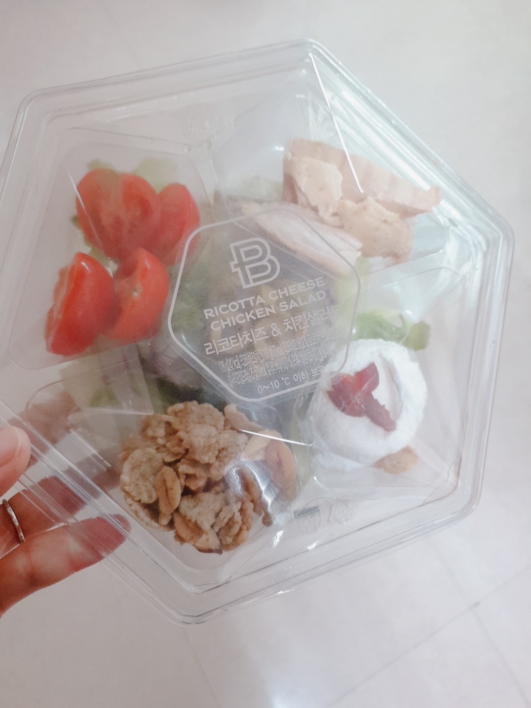 이렇게 주문한 리코타 치킨 샐러드! 크림치즈는 바로 냉장고로 직행했습니다. 샐러드는 지점 바이 지점이라고 하는데 제가 인터넷으로 찾아봤던 샐러드 비주얼과는 좀 달랐어요. 토핑이 각자 담겨져나와 원하는 것만 넣을 수 있다는 장점은 있지만 저 토핑 통이 자리를 차지하는 바람에 푸짐한 양은 아니었답니다. 리코타치즈 샐러드지만 치즈양이 그닥 많지 않았구요...