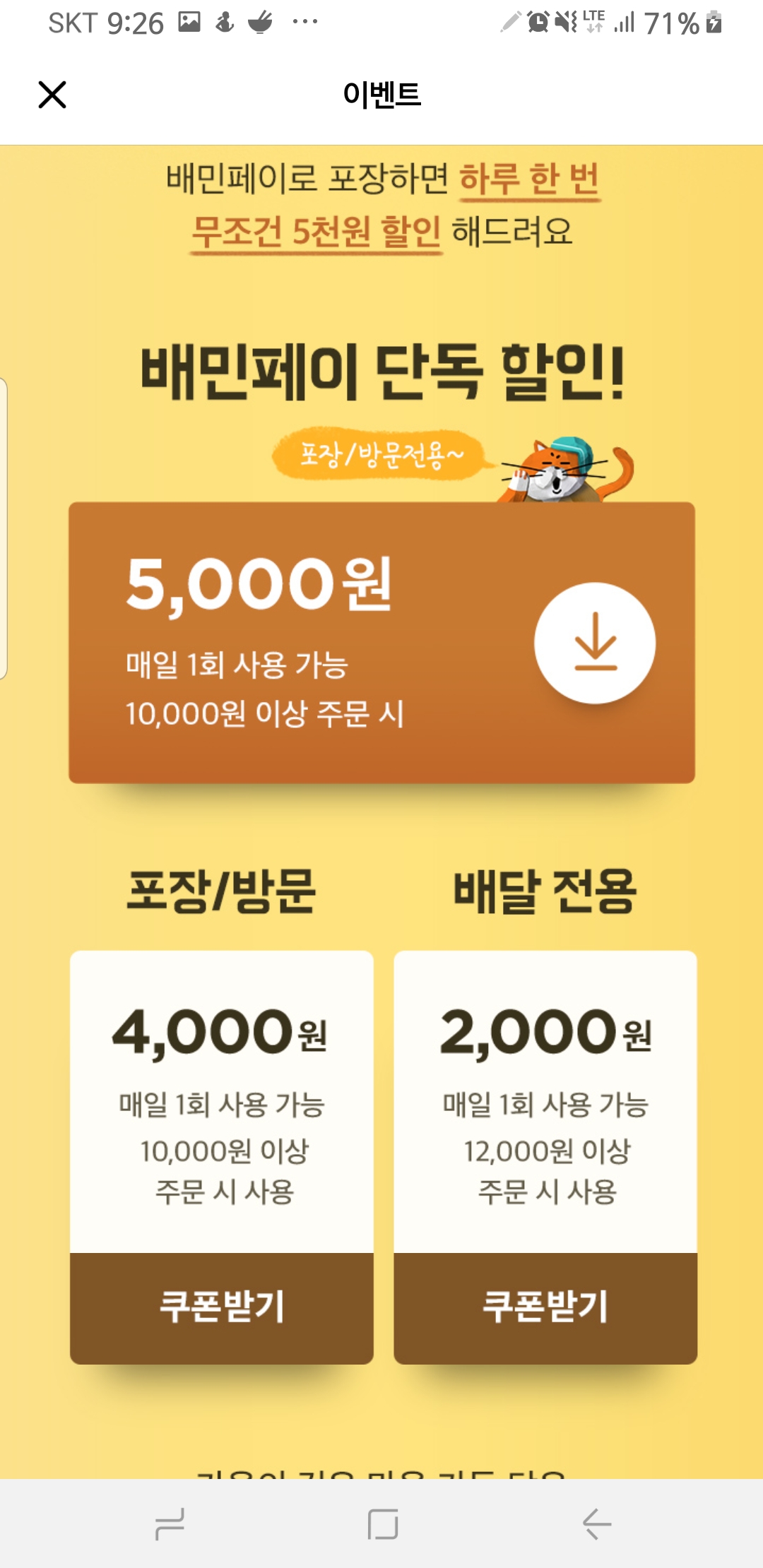 유의 사항이 이벤트 안내 하단에 적혀져 있는데요. 쿠폰은 전화주문이나 만나서 결제 시에는 적용이 불가하다고 합니다. 중복 사용도 불가하구요. 사실 배민페이로 결제하면 네이버페이와 같이 포인트로 주문하시는 분들, 통신사 할인을 받으시는 분들은 손해기도 할테지만 할인율 50퍼니 한번 쯤은 해볼만한 이벤트라 봅니다.