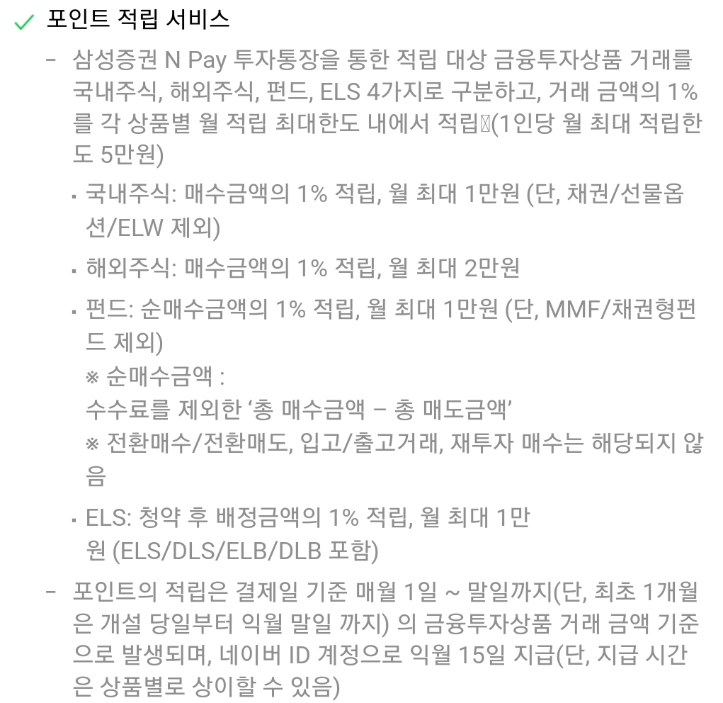 무한대로 적립해주면 좋겠지만, 매달 국내주식 100만원,펀드 100만원,해외주식 200만원, ELS 100만원 투자시 5만원을 네이버 페이 포인트로 지급받는 것이 받을 수 있는 최대 혜택이다. 필자의 경우에는 어차피 삼성증권에서 ELS를 가입하려고 했었기 때문에 Npay통장은 나쁘지 않은 선택이었다.