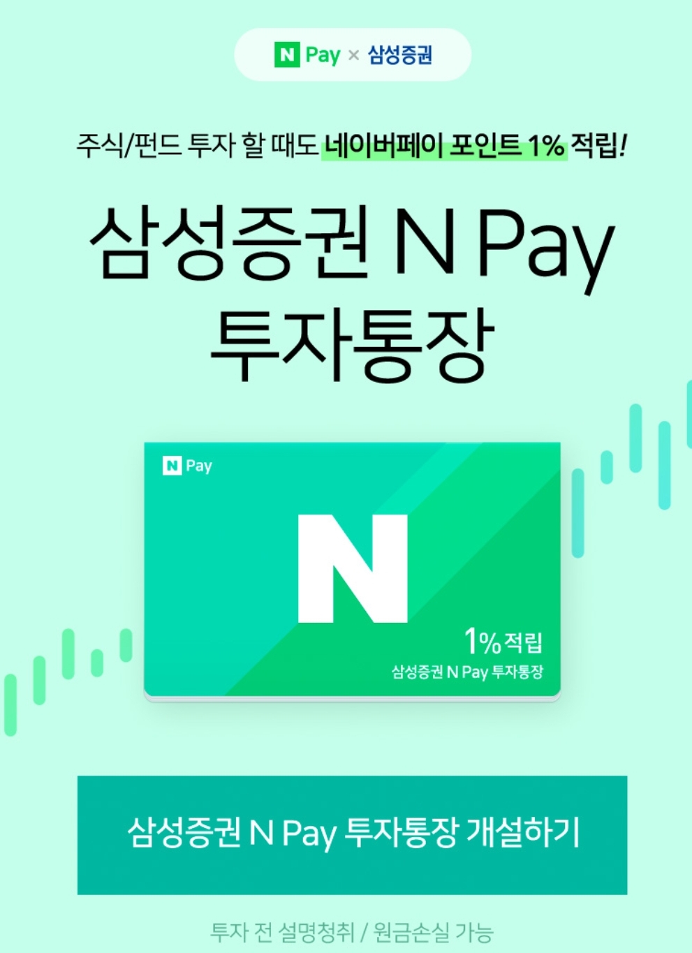 사람들이 실생활에서 사용하고 있는 검색엔진 또는 SNS와 협업하여 광고효과를 누리는 회사들이 많아지고 있다. 카카오페이나 네이버페이×은행 또는 증권사들의 콜라보가 주류를 이루고 있는데 그 중 내가 선택한 것은 바로 '삼성증권 N Pay 투자통장'이다.