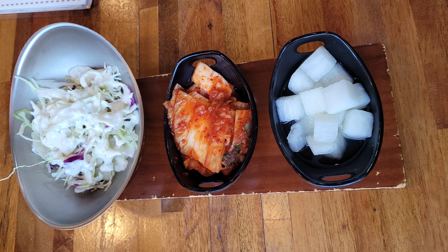 메뉴를 주문하면 샐러드, 김치, 무가 세팅되는데요. 사실 그냥 어디서나 먹을 수 있는 기본찬인데, 신선도는 살짝 떨어지는 느낌이 들었어요. 샐러드는 왠만하면 잘 먹는데 소스가 좀 느끼하달까요...? 남긴 적은 거의 처음....