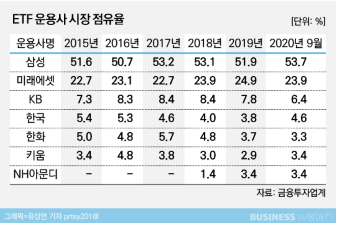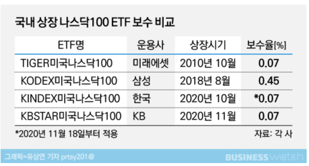 10월에는 한국투자증권이 국내 상장 나스닥 100 ETF 수수료를 0.07%로 출시하자 미래에셋과 KB증권이 수수료를 0.07%로 낮추는 상황이 벌어지기도 했습니다. 삼성증권의 ETF 시장 점유율이 독보적이기 때문에 삼성증권은 아직 0.45%를 유지하고 있는 콧대높은 자세를 취하고 있습니다.
