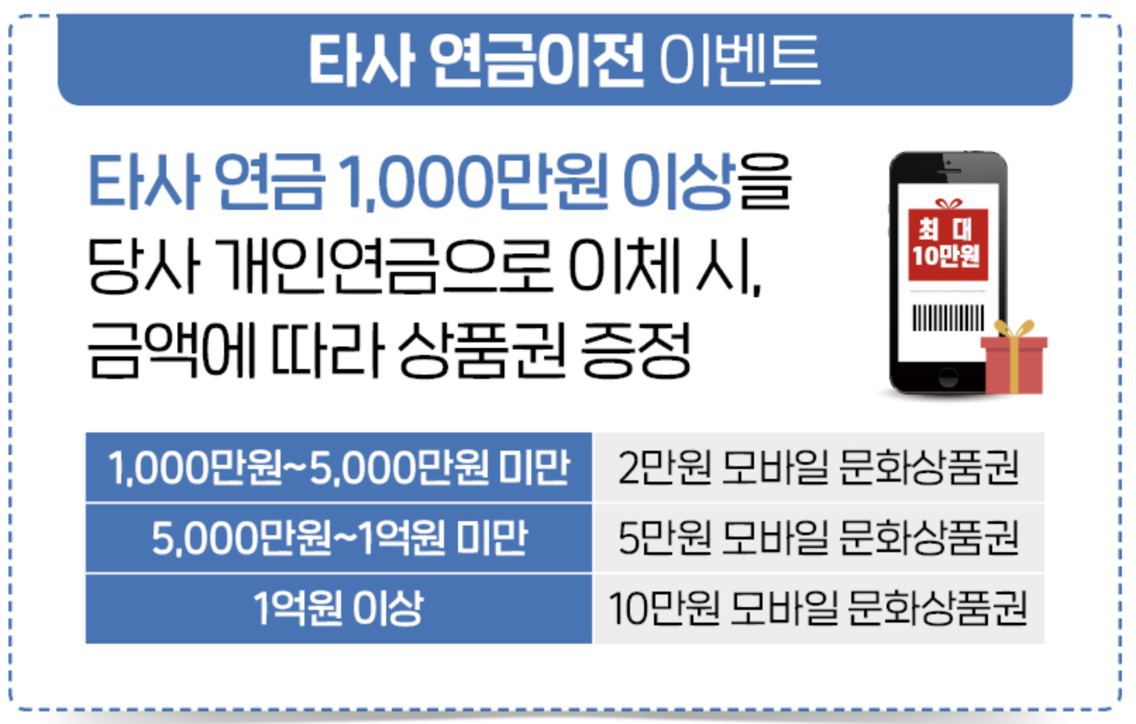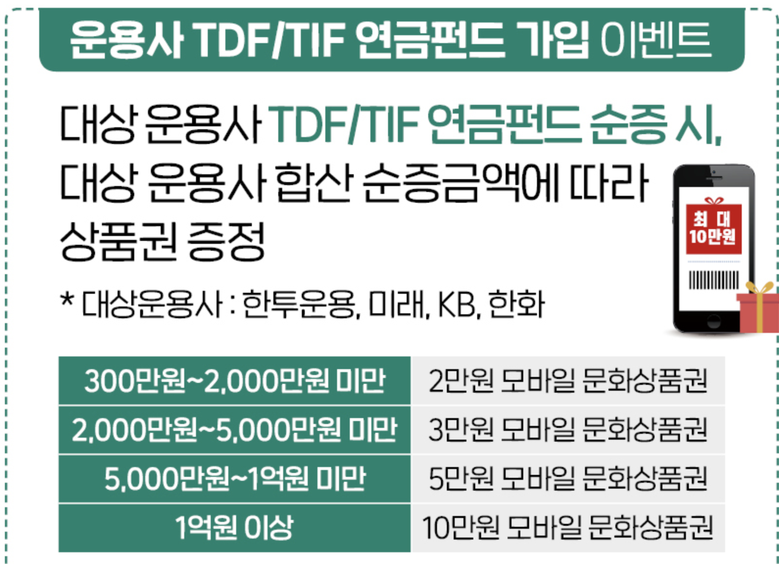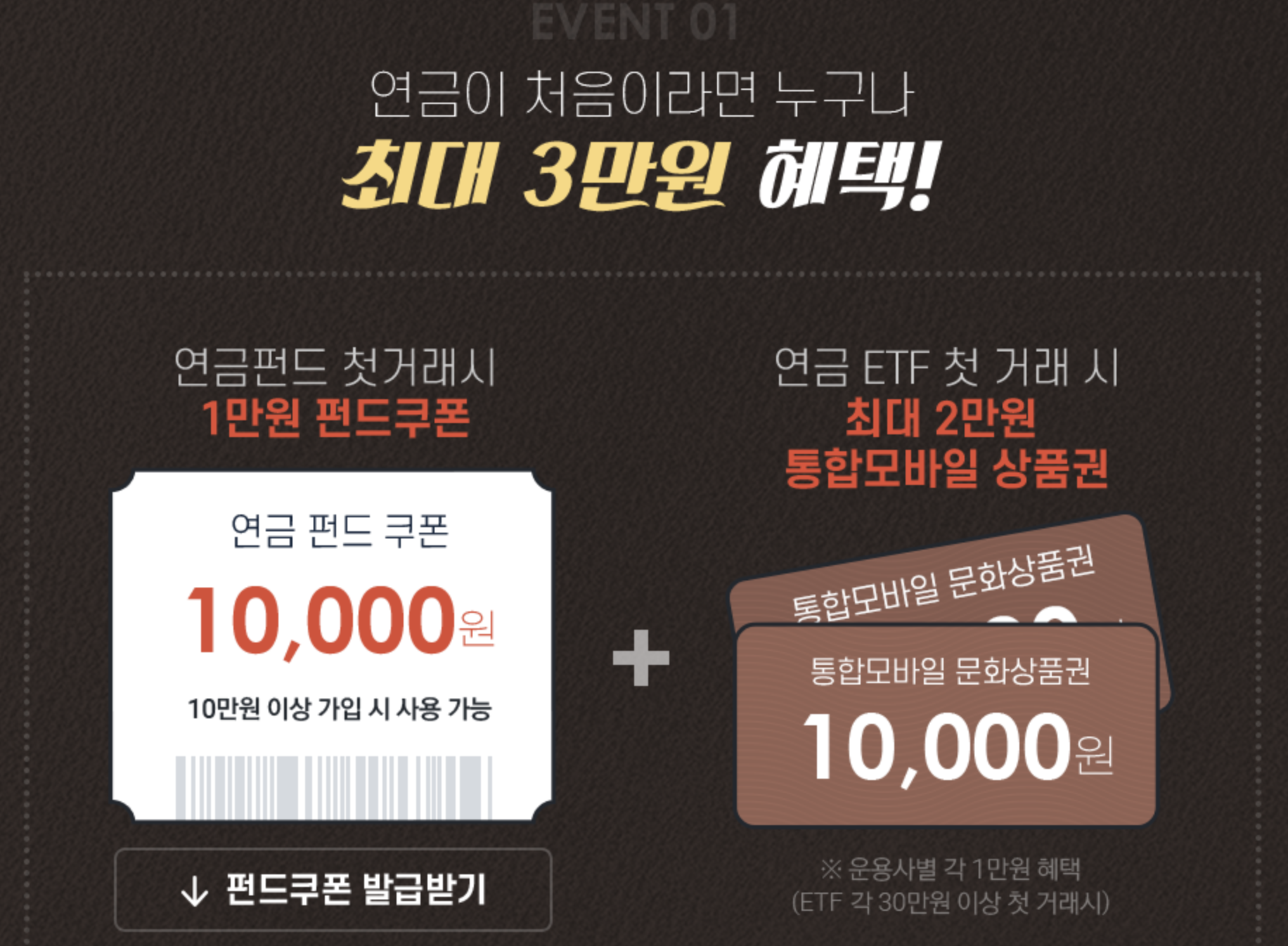 이벤트가 4개나 되는데요. 다양해보이지만 저같이 ETF로 신규가입하는 고객에게는 실속없는 이벤트입니다. 개인연금 첫 신규가입 이벤트로 20만원 연금펀드 매입& 자동이체 월 20만원/3년 이상 신규 등록 시에 1만원 통합모바일 문화상품권 증정 이벤트가 있습니다. 다만, ETF 상품은 제외인 점! 유의하여야 합니다. 펀드로 굴리시고 싶으신 분들은 적합할 듯 싶네요.