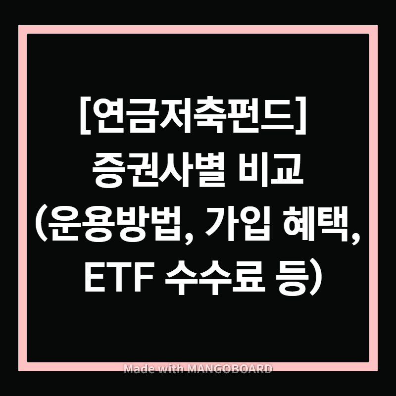 때문에 증권사별로 비교하는 과정을 거쳤고, 그 과정을 이번 포스팅에서 다뤄보려고 합니다. 참고로 저는 연금저축펀드를 ETF로 관리할 예정이기 때문에, ETF 투자가 가능한 증권사에서 가입할 것이구요. 은행에서 연금저축펀드를 가입하신 분들은 ETF 매수가 어려울 수 있으니 펀드를 이관하시는 방법도 있습니다. 저는 펀드는 수수료까지 신경을 많이 써야 해서 가입을 지양하는 편입니다.