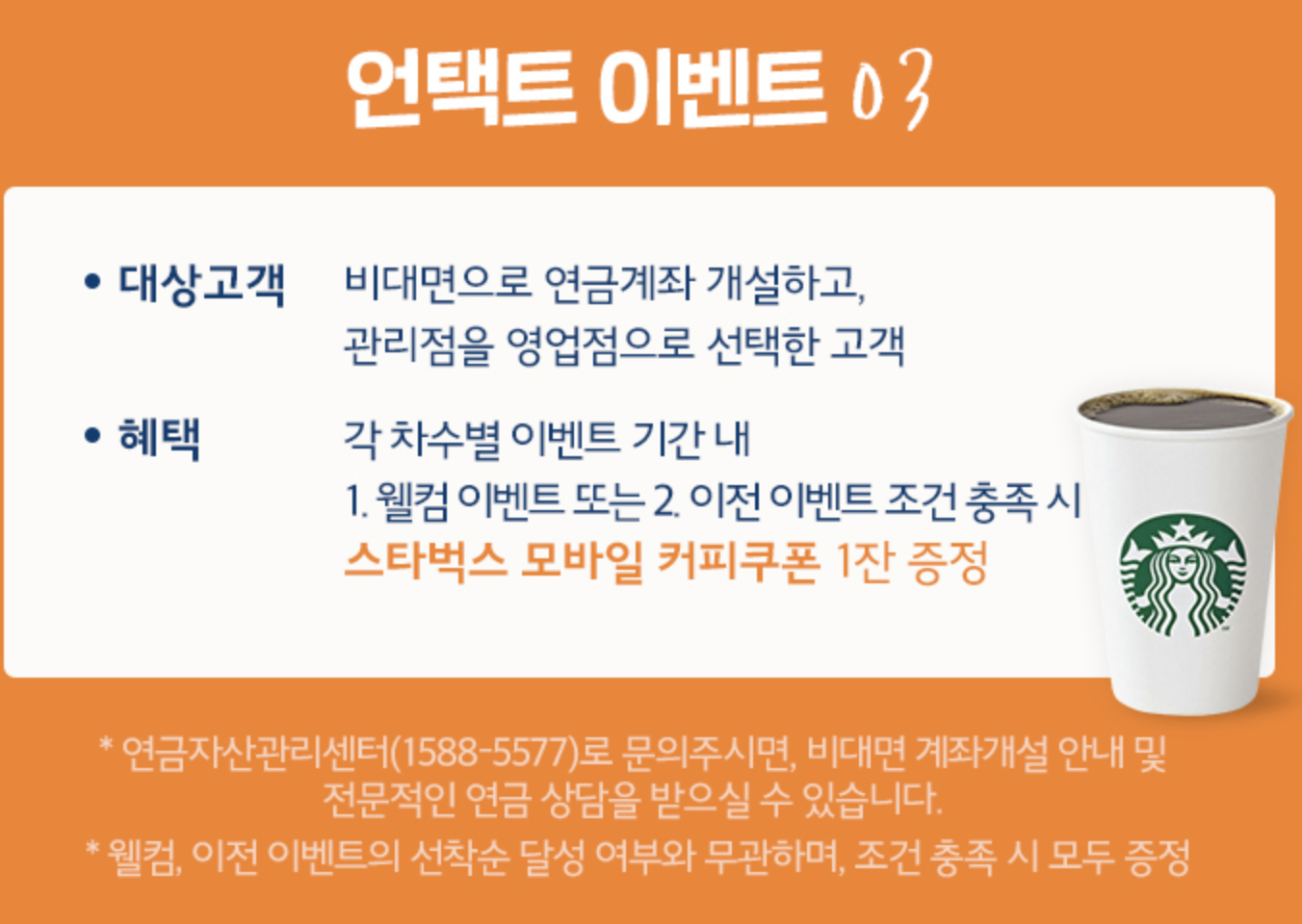 '연금은 투자다'라는 시즌2 이벤트를 열고 있는데요. 신규 비대면 개설 + 10만원 이상 입금하실 경우에 스타벅스 아메리카노 한잔, 기존계좌 신규 입금, 혹은 타 연금을 가져오실 경우에는 300만원 이상 스타벅스 아메리카노 1잔, 1천만원 이상 신세계상품권 3만원 등의 이벤트를 열고 있습니다. 추천상품매수의 경우에도 아메 1잔을 주지만 이건 굳이 할 필요는 느껴지지 않습니다....^_^
