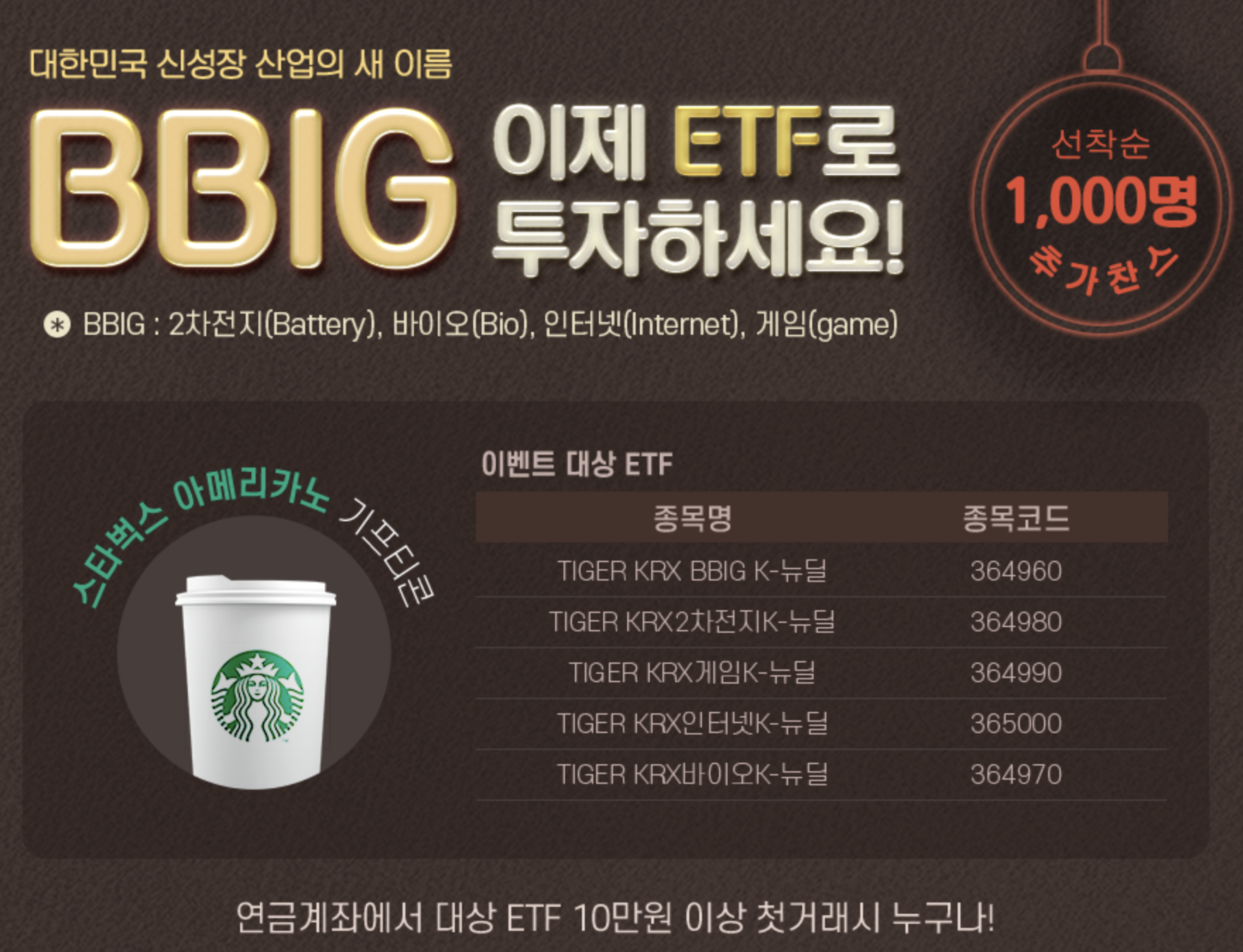 연금 ETF 첫 거래 시 최대 2만원의 통합모바일 문화상품권을 받을 수 있고요. 100만원 이상 거래 시 1만원 문화상품권을 받을 수 있습니다. 펀드로 거래하시는 분들도 펀드쿠폰과 순증 금액에 따라 문화상품권을 받으실 수 있습니다. 또한 선착순 1,000명을 대상으로 2차전지, 바이오, 인터넷, 게임 ETF에 10만원 이상 투자할 경우 스타벅스 아메리카노 기프티콘을 받을 수 있는 통큰 이벤트를 펼치고 있네요. 키움증권이 연금저축펀드/IRP 후발주자라서 그런지 이벤트 규모가 꽤 큰 편입니다.