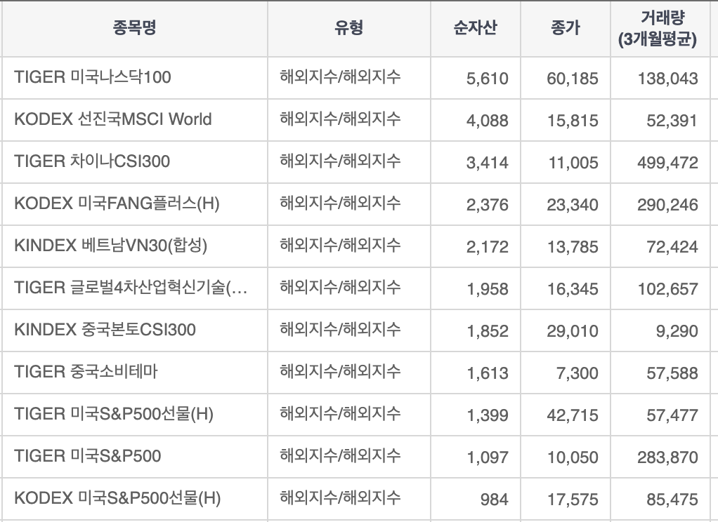 상단의 이미지는 해외지수를 추종하는 ETF를 '순자산'을 기준으로 순위 매긴 리스트입니다. 1위는 TIGER 미국나스닥100으로 미국 나스닥 100지수를 추종하는 ETF인데요. 4위인 KODEX 미국 FANG플러스(H)에 비해 두 배 이상 규모가 큰 ETF입니다. 지난 3년간 93.45%의 수익률을 냈던, 해외 지수 ETF로는 제일 성과가 좋기도 합니다.
