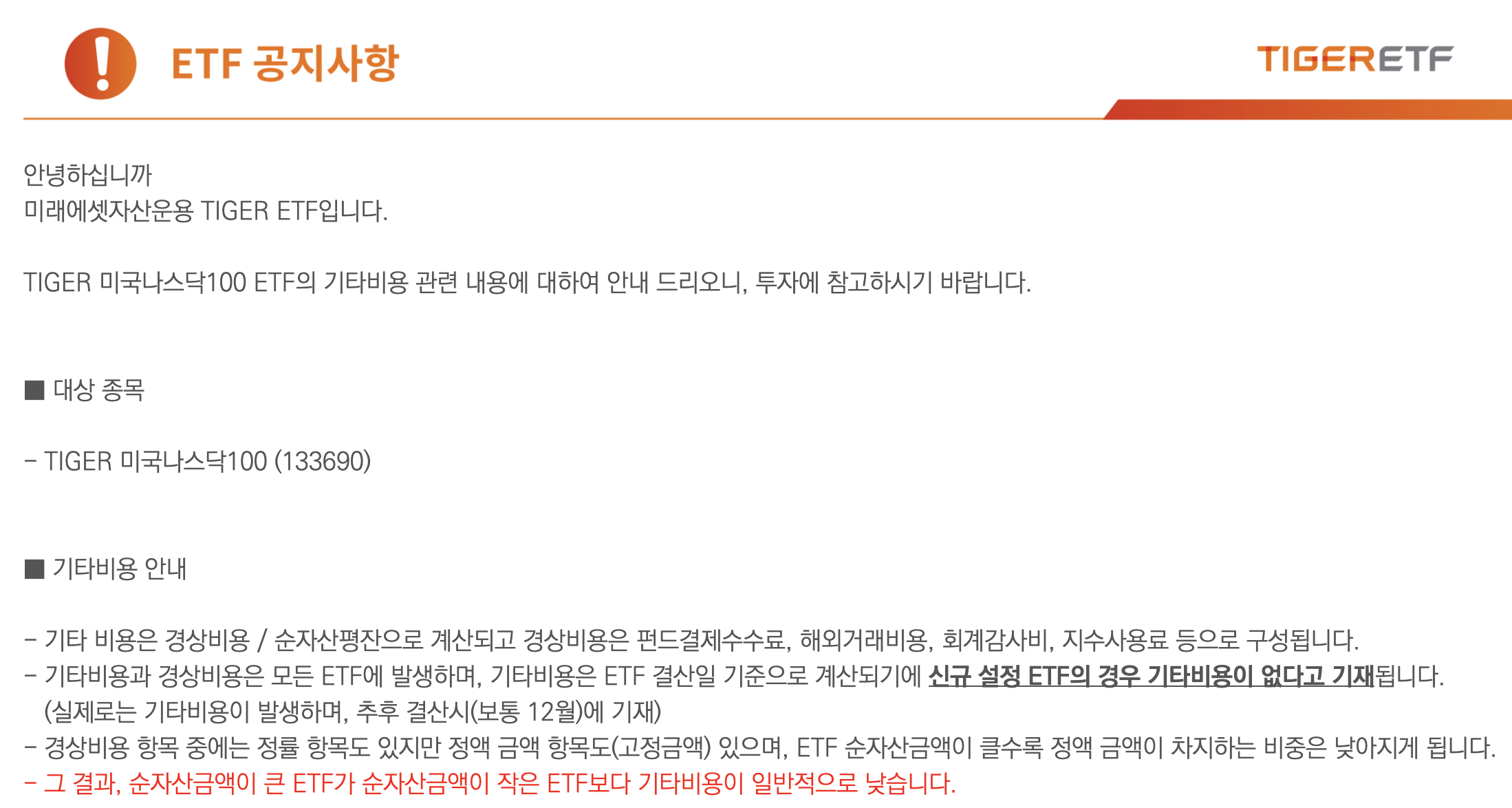 공지사항의 요지는, tiger미국 나스닥100 ETF말고도